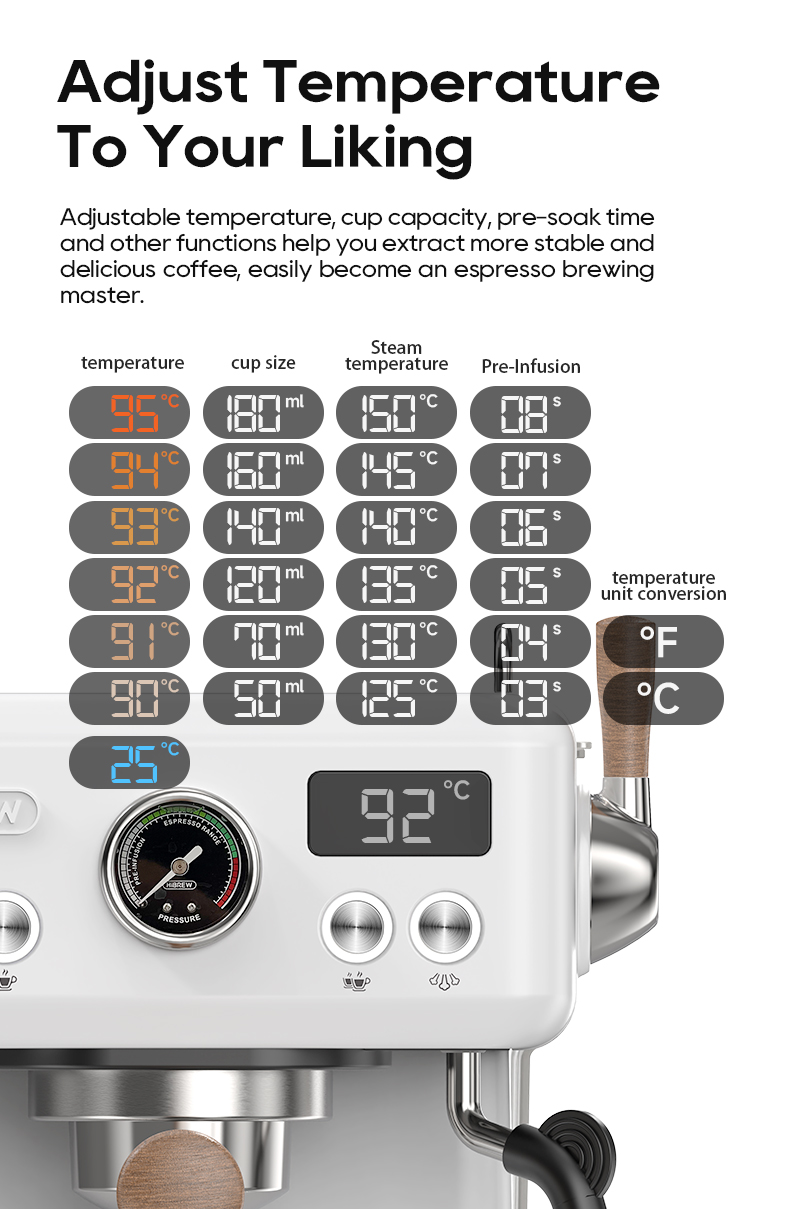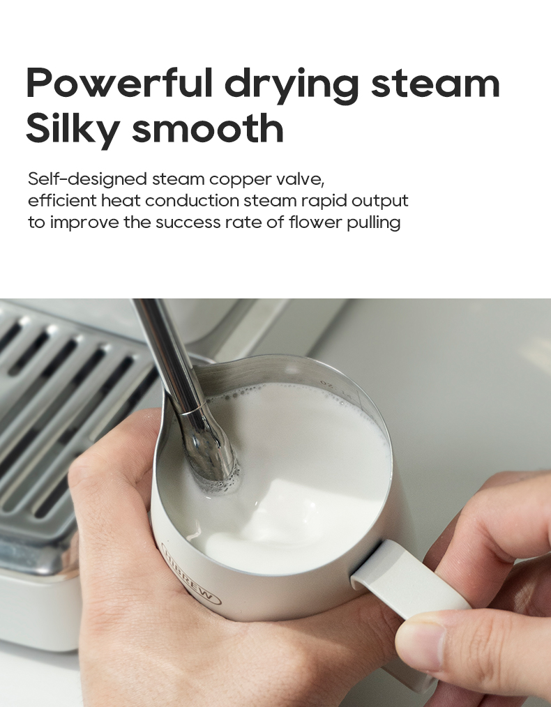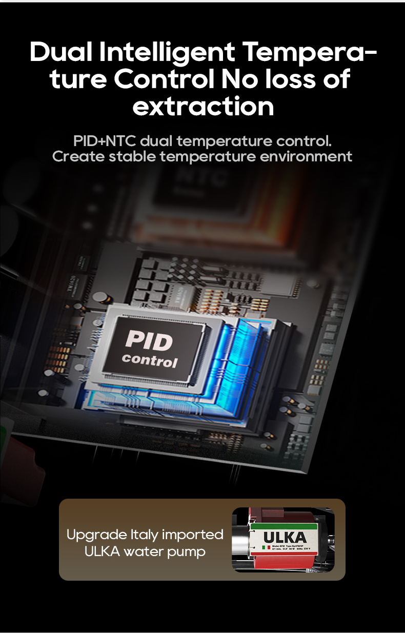 - Tasainen lämmitys ja vahva höyry: PID- ja NTC-järjestelmät vakauttavat uutto- ja höyrylämpötilat johdonmukaisiin espressoihin. Kuparinen höyryventtiili tuottaa sileän maitovaahdon latte-taiteeseen.
