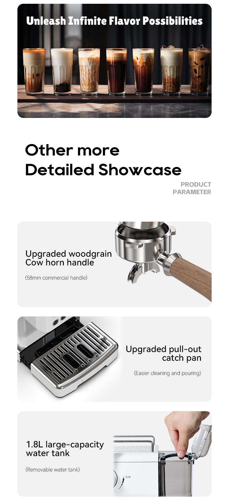 - Paineenhallinta ja turvallisempi kahvan irrotus: 20 barin pumppu ja kolme jännitetilaa (H / L1 / L2) säätävät virtausnopeutta aromin ja kofeiinin tasapainottamiseksi. Automaattinen paineenpoisto helpottaa kahvan turvallisempaa irrotusta uuton jälkeen.