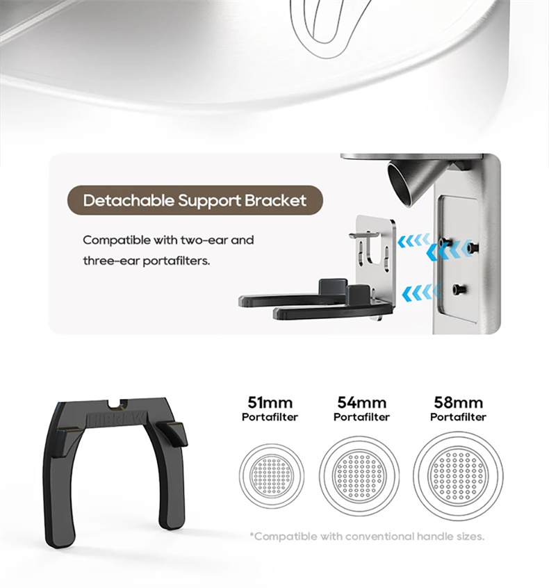 - Helppo puhdistaa ja käytännölliset varusteet: Irrotettavat vesisäiliöt ja osat helpottavat huoltoa. Mukana sihdit, puukahvainen tamper sekä suurempi 450 ml kannu. Kompakti koko sopii keittiön kahvikulmaan.