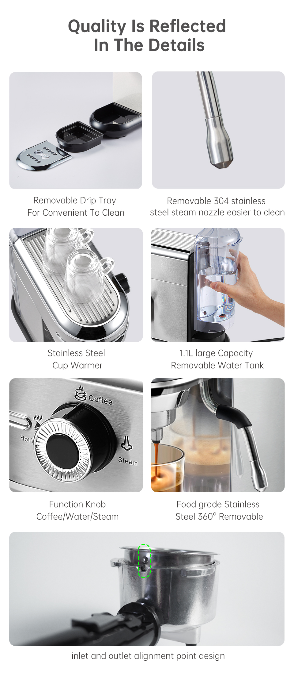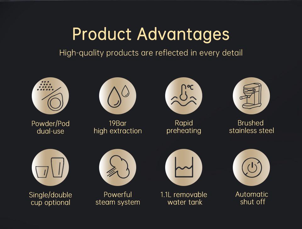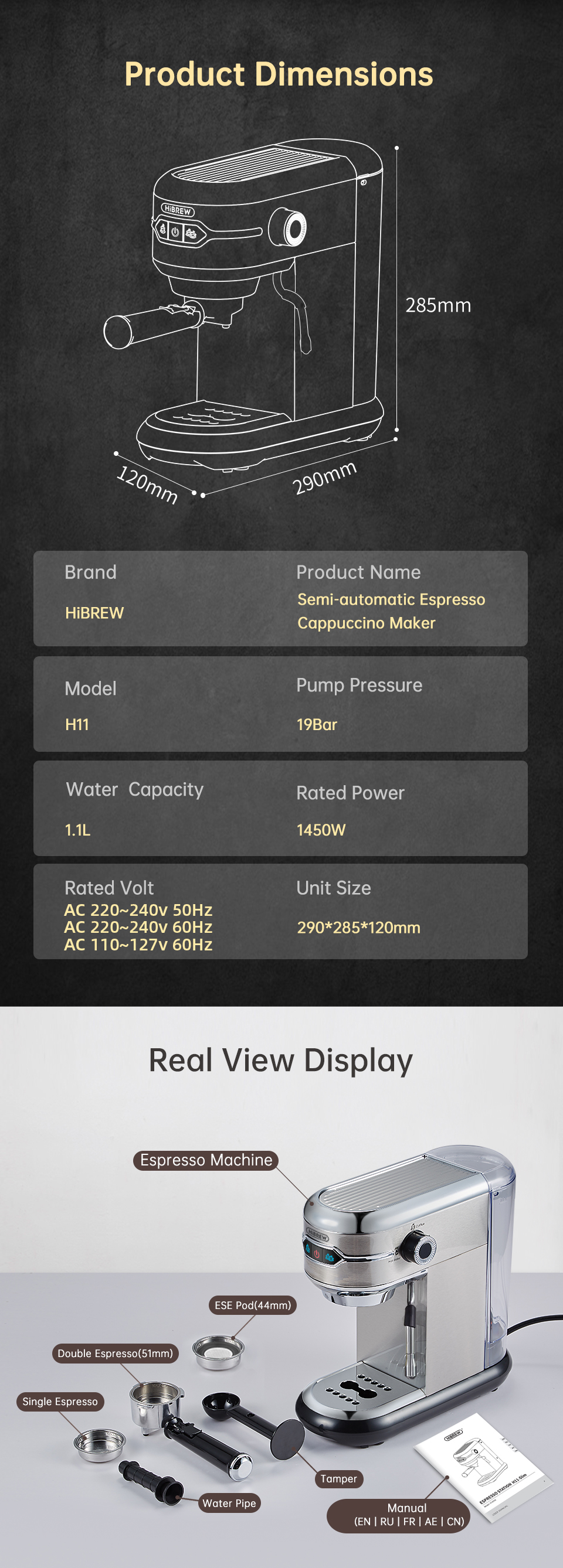 Brändi: HiBREW Malli: H11 Väri: hopeinen Kuoren materiaali: ruostumaton teräs Pumpun paine: 19 bar Teho (W): 1450 Jännite (V): AC 220-240V, 50/60Hz Vesisäiliö: 1.1 L Esilämmitysaika: 25 s Kapselityyppi: jauhettu kahvi / ESE-podi Automaattinen virrankatkaisu: kyllä Tarkka lämpötilansäätö: kyllä (NTC-ohjaus) |