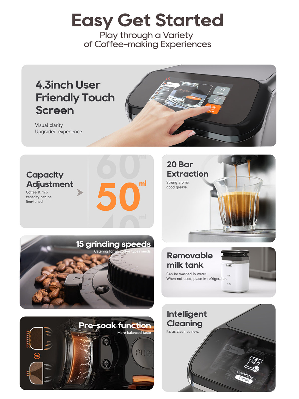 Värikäs 4.3-tuumainen kosketusnäyttö on selkeä ja intuitiivinen. Älykäs puhdistusjärjestelmä helpottaa ylläpitoa ja pitää laitteen hyvässä kunnossa vähällä vaivalla.