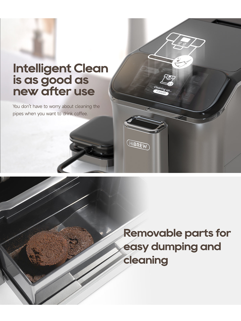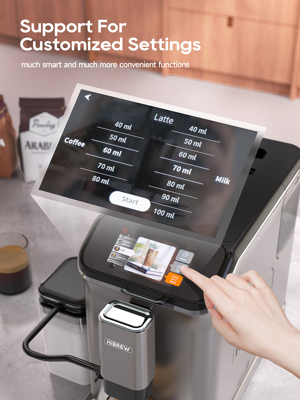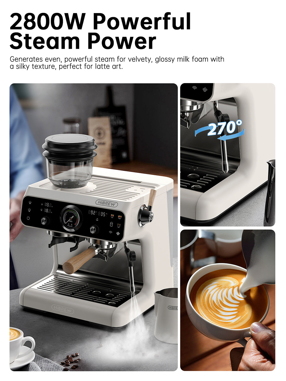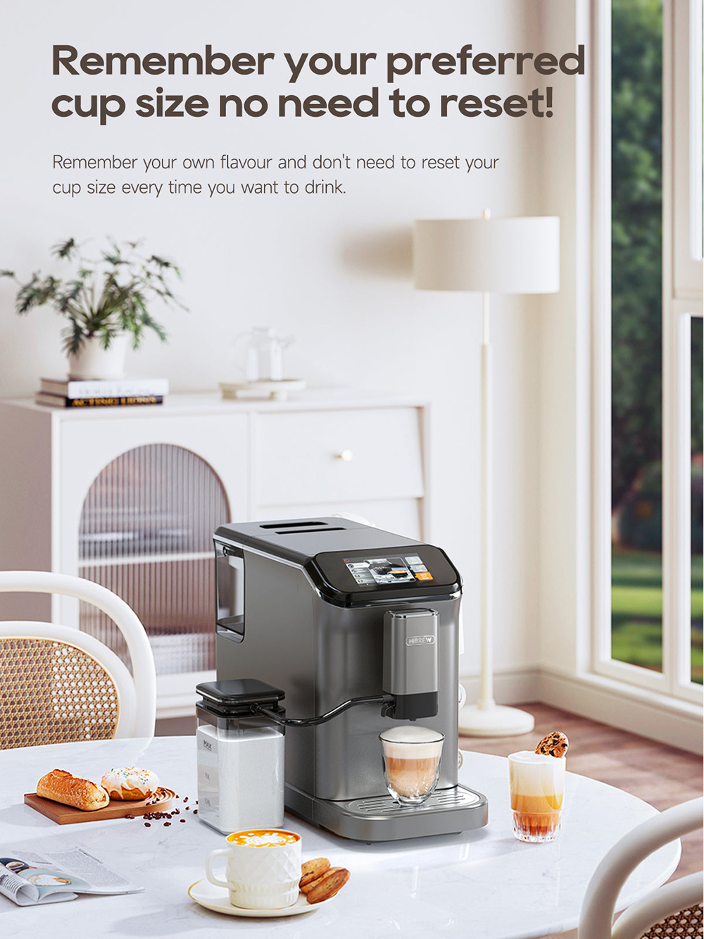 HiBREW H16 on täysautomaattinen kahvikone kotikäyttöön. Se yhdistää sisäisen kahvimyllyn, kaksoiskattilan, maitovaahtimen ja selkeän 4.3-tuumaisen kosketusnäytön, jotta saat tasalaatuisen kahvin helposti yhdellä painalluksella.
