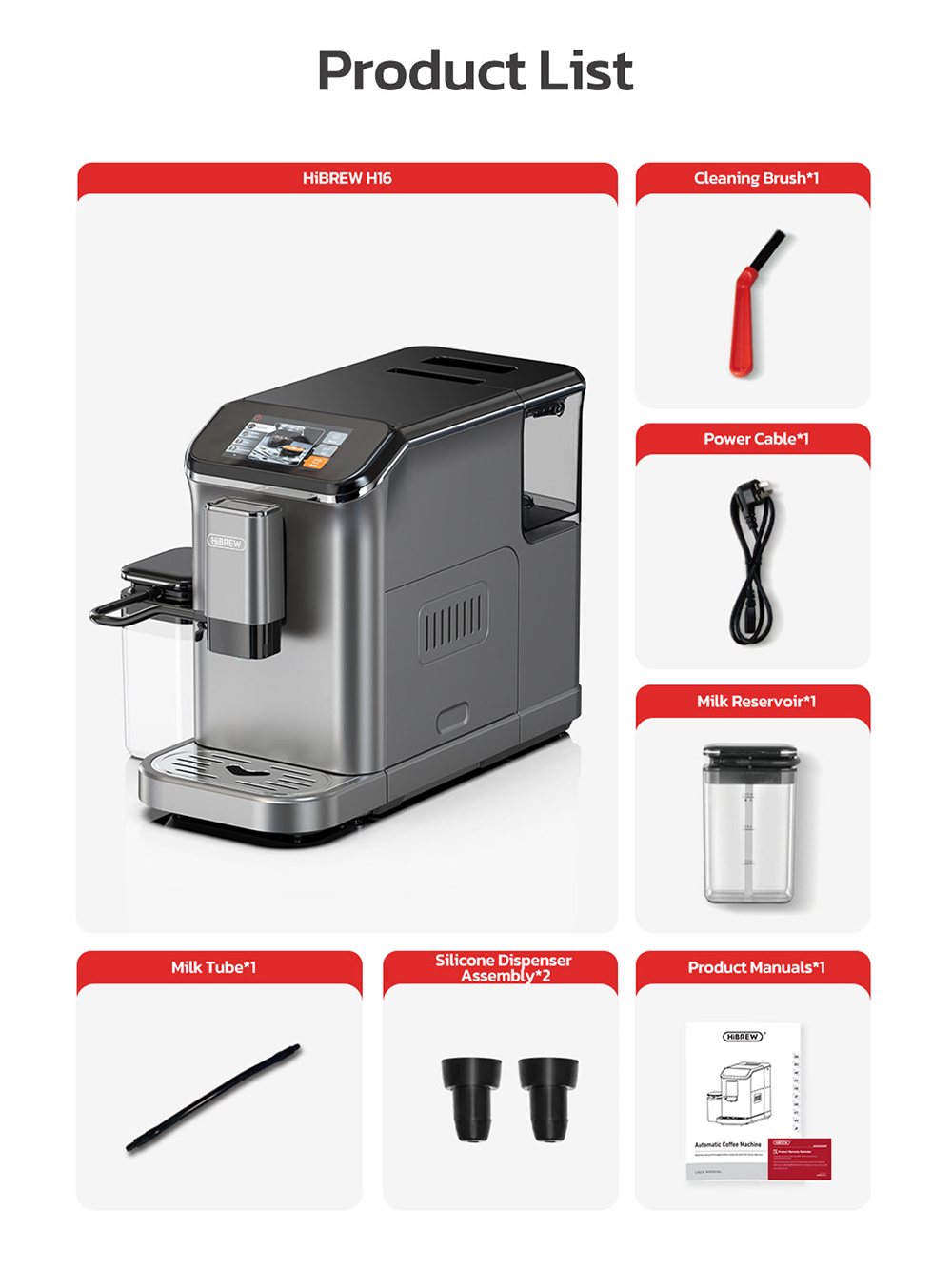 1 x HiBREW H16 kahvikone 1 x puhdistusharja 1 x virtajohto 1 x maitosäiliö 1 x maitoputki 2 x silikoninen annostelukokoonpano 1 x käyttöohje |