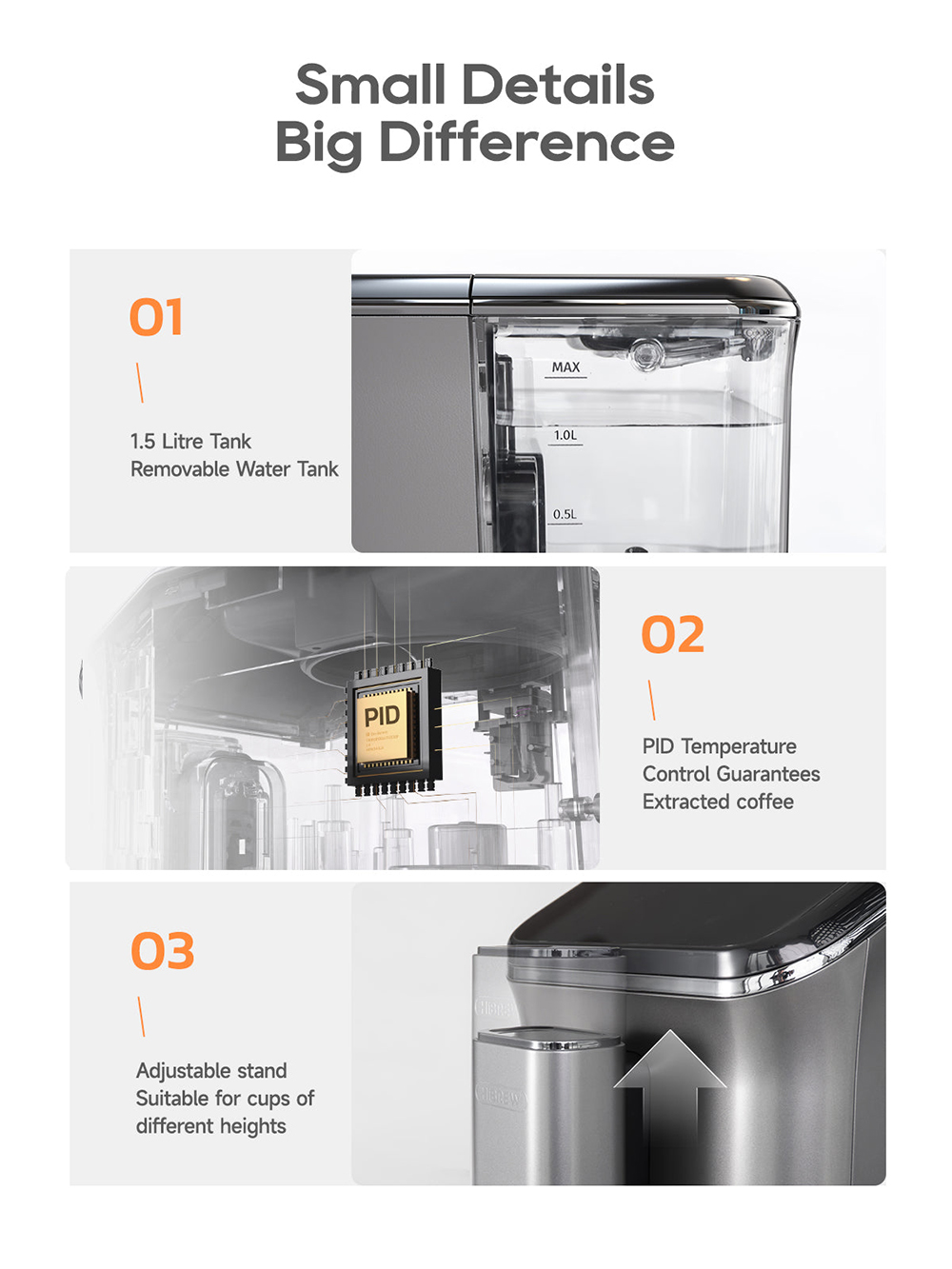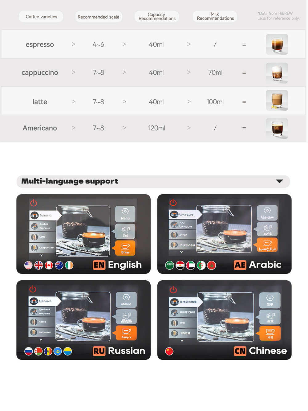 Brändi: HiBREW Malli: H16 Nimellisteho: 1350W Pumpun paine: 20 bar Nimellisjännite: AC 220-240V 50Hz/60Hz Vesisäiliö: 1.5L Näytön koko: 4.3-tuumainen Jauhatuksen säätö: 15 tasoa Lämmityselementti: kaksoiskattila |