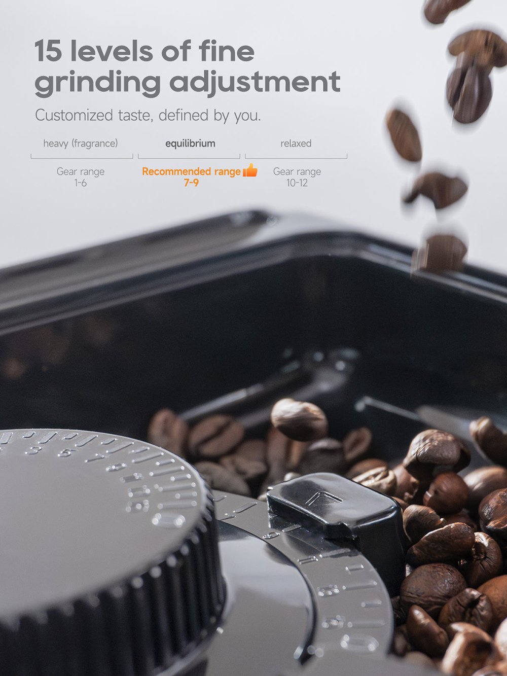 Tarkka ruostumattomasta teräksestä valmistettu kartioterämylly, 15 jauhatustasoa. Tasainen jauhatustulos maksimoi maun, ja vähäinen lämpökuormitus säilyttää kahvin luonnollisen aromin.