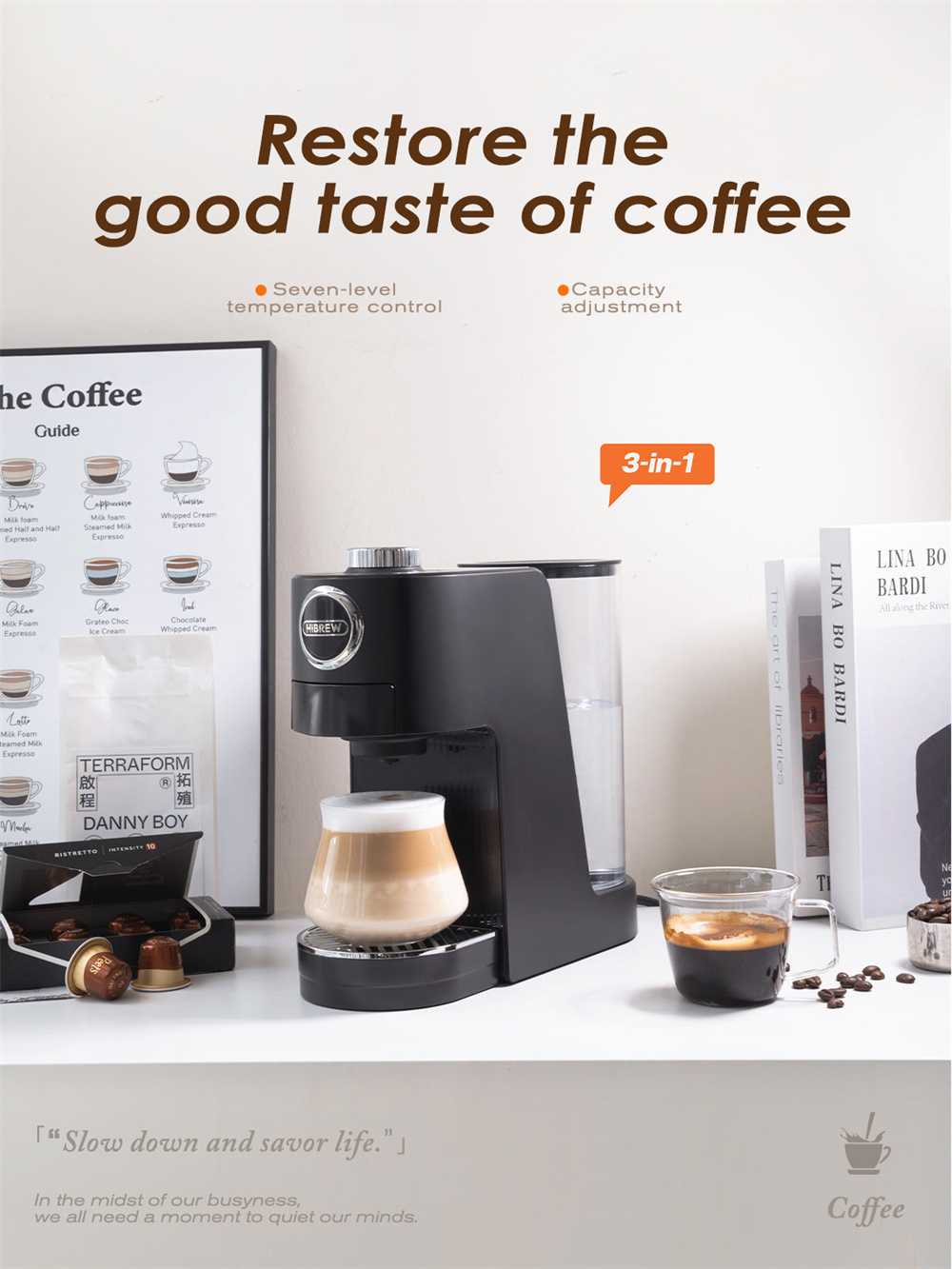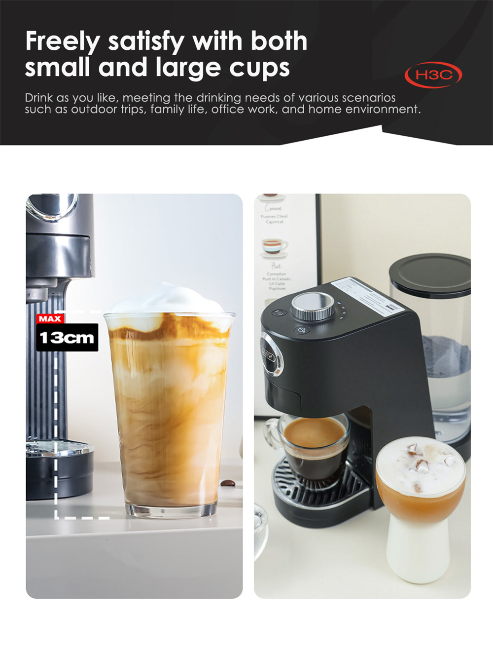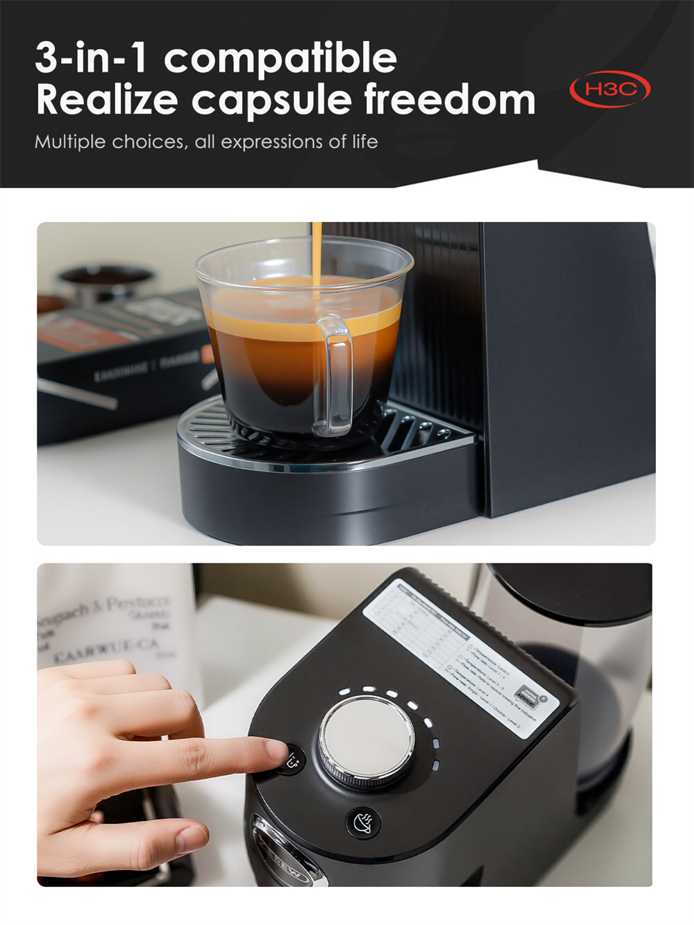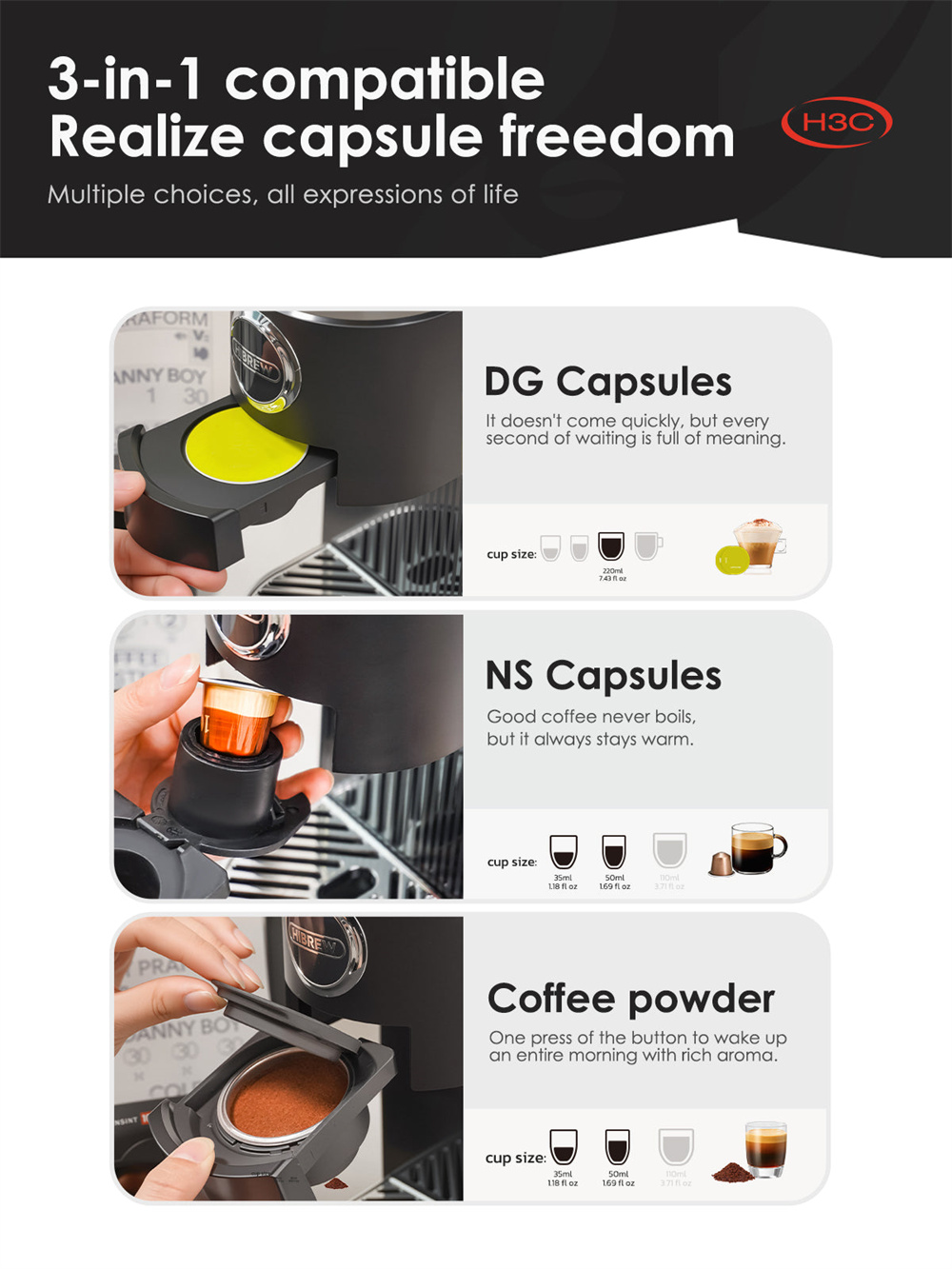 Monipuolinen HiBREW H3C tarjoaa 3-in-1-kahvijärjestelmän, joka toimii DG- ja NS-kapseleilla sekä jauhetulla kahvilla. Valitse lämpötila ja vesimäärä tarkasti 7-portaisella lämpötilansäädöllä ja säädettävällä vesimäärällä. Yhden painikkeen käyttö yhdessä sähkötoimisen puristusjärjestelmän kanssa tuottaa korkean paineen uuton ilman käsivipua. Suuri 1.4L vesisäiliö riittää jopa 12 kupille (120 ml Americano), ja kompakti muotoilu vetonupilla, ulosvedettävällä tarjottimella ja selkeillä LED-merkkivaloilla sopii arjen käyttöön.