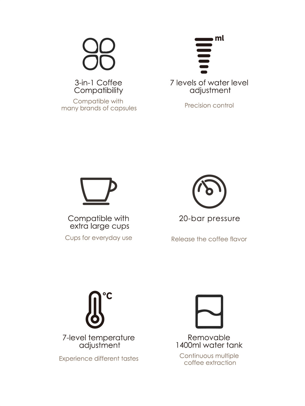 - Suuri 1.4L vesisäiliö: jopa 12 x 120 ml Americanoa