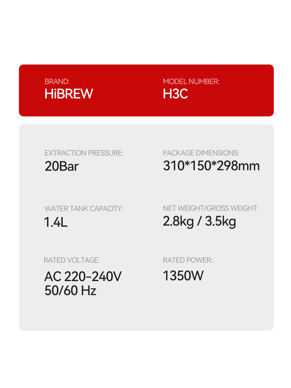 Brändi: HiBREW Malli: H3C Väri: musta, valkoinen Pumpun paine: 20 bar Nimellisteho: 1350W Vesisäiliön tilavuus: 1.4L Nimellisjännite: AC 220–240V 50Hz/60Hz |