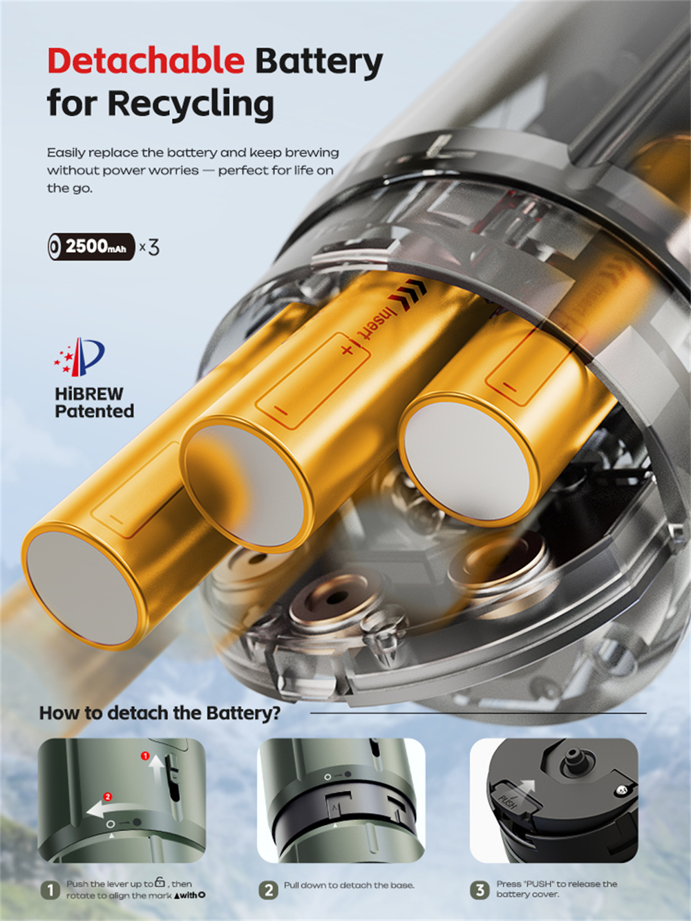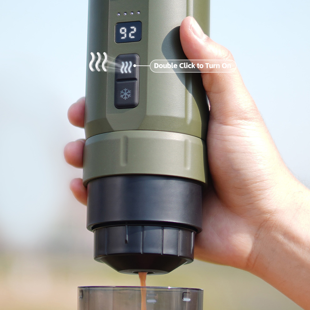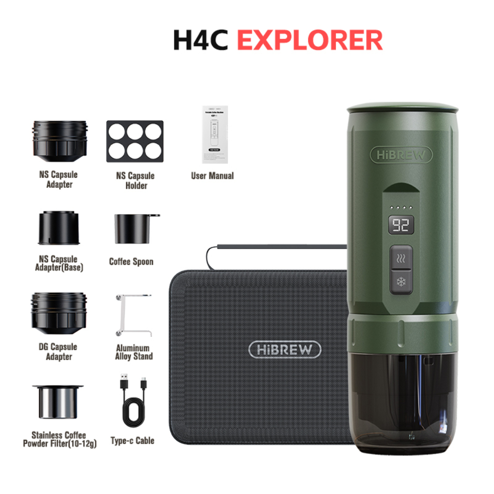 HiBREW H4C on kannettava espressokone, joka tarjoaa 3-in-1‑kahvinvalmistuksen: jauhettu kahvi, NS‑kapselit ja DG‑kapselit. Säädettävä lämpötila PID-ohjauksella (85–95°C) ja valittava uuttotilavuus helpottavat halutun maun saavuttamista. 20 barin paine tuottaa täyteläisen creman. Irrotettava, vaihdettava akku mahdollistaa keskeytyksettömän käytön. IPX4‑roiskevesisuoja ja kompakti rakenne sopivat matkalle, retkeilyyn ja etätyöhön.