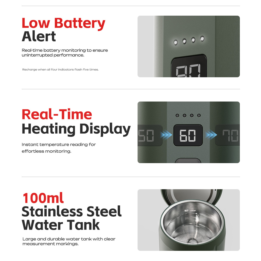Huom: Täyteen ladattu akku voi kuumentaa vettä noin 3 kuppia (100 ml), 4 kuppia (75 ml) tai 5 kuppia (50 ml). Kun käytät valmista kuumaa vettä ja suoraa uuttoa, voit valmistaa yli 200 kuppia.
