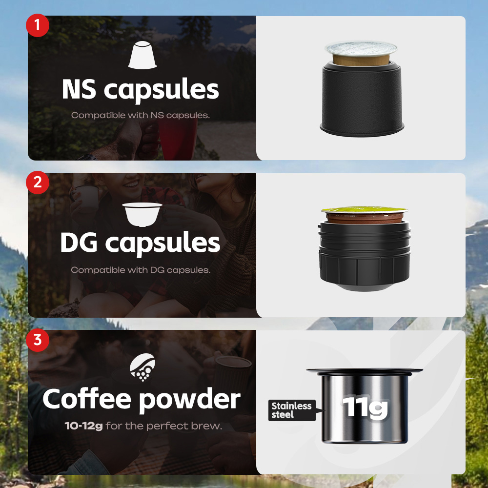 - 3-in-1‑joustavuus: yhteensopiva jauhetun kahvin, NS‑kapseleiden ja DG‑kapseleiden kanssa