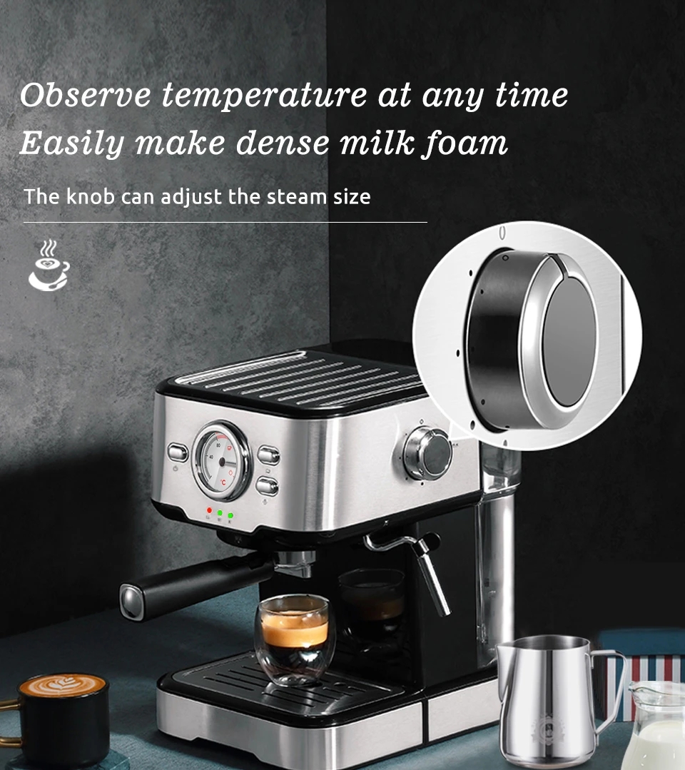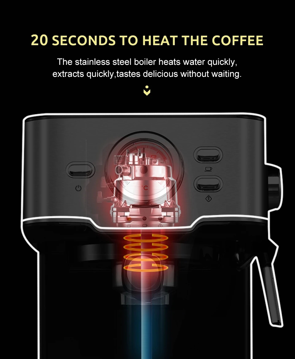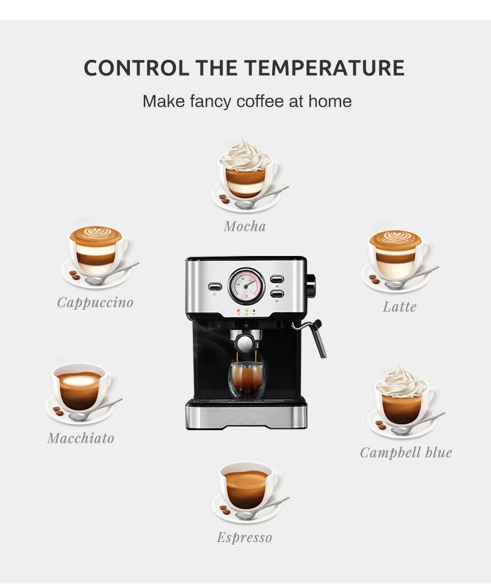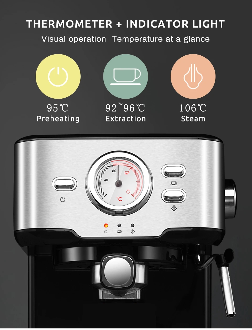 - Selkeä lämpötilanäyttö: suuri lämpötilamittari ja merkkivalot helpottavat oikean lämpötilan seurantaa eri juomia varten, kuten mocha, cappuccino, macchiato, espresso ja latte.