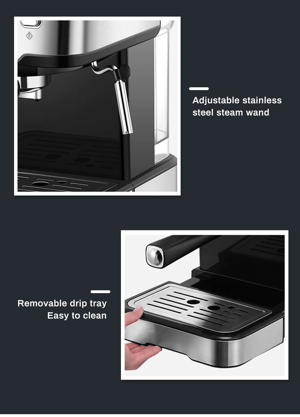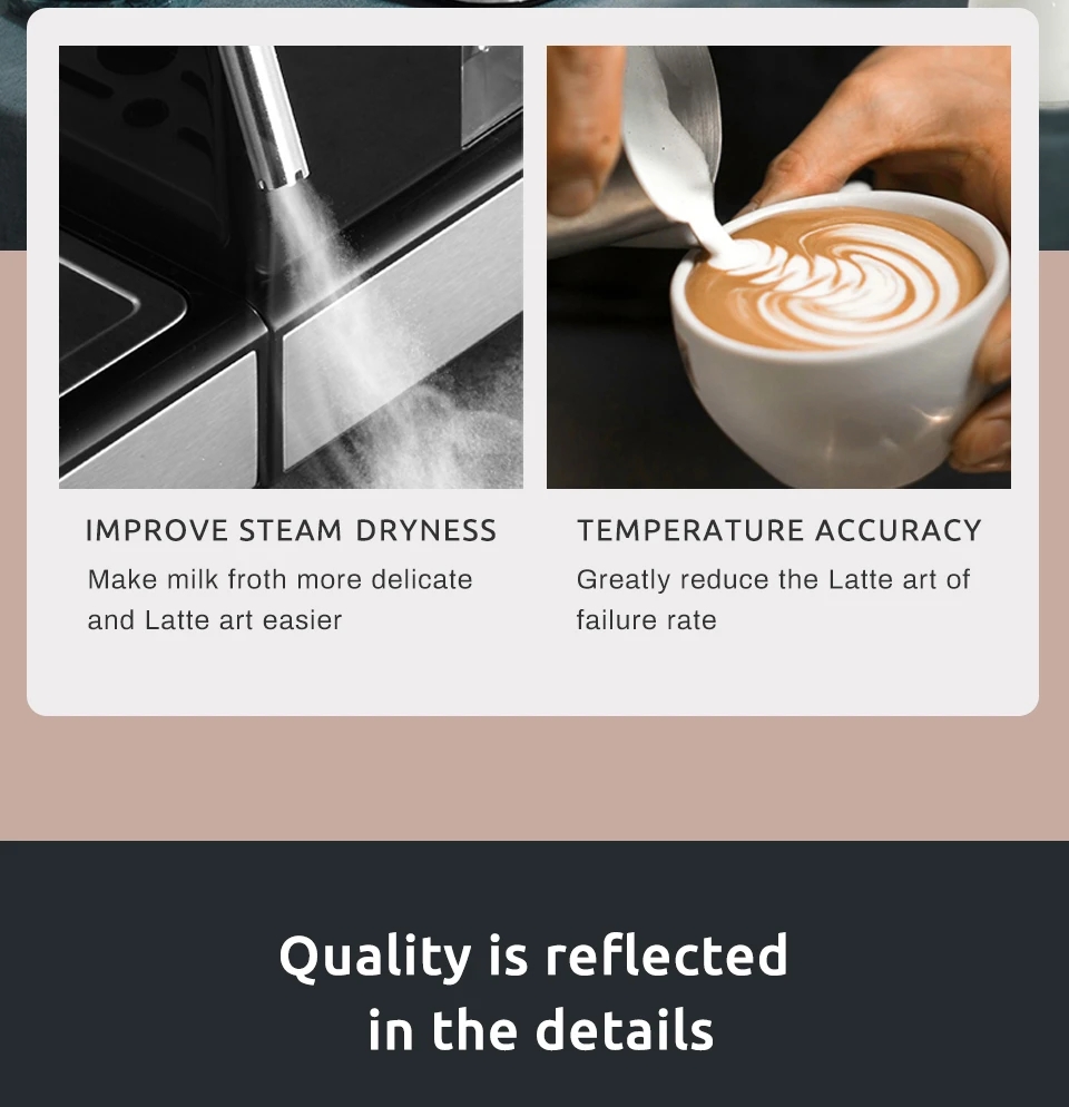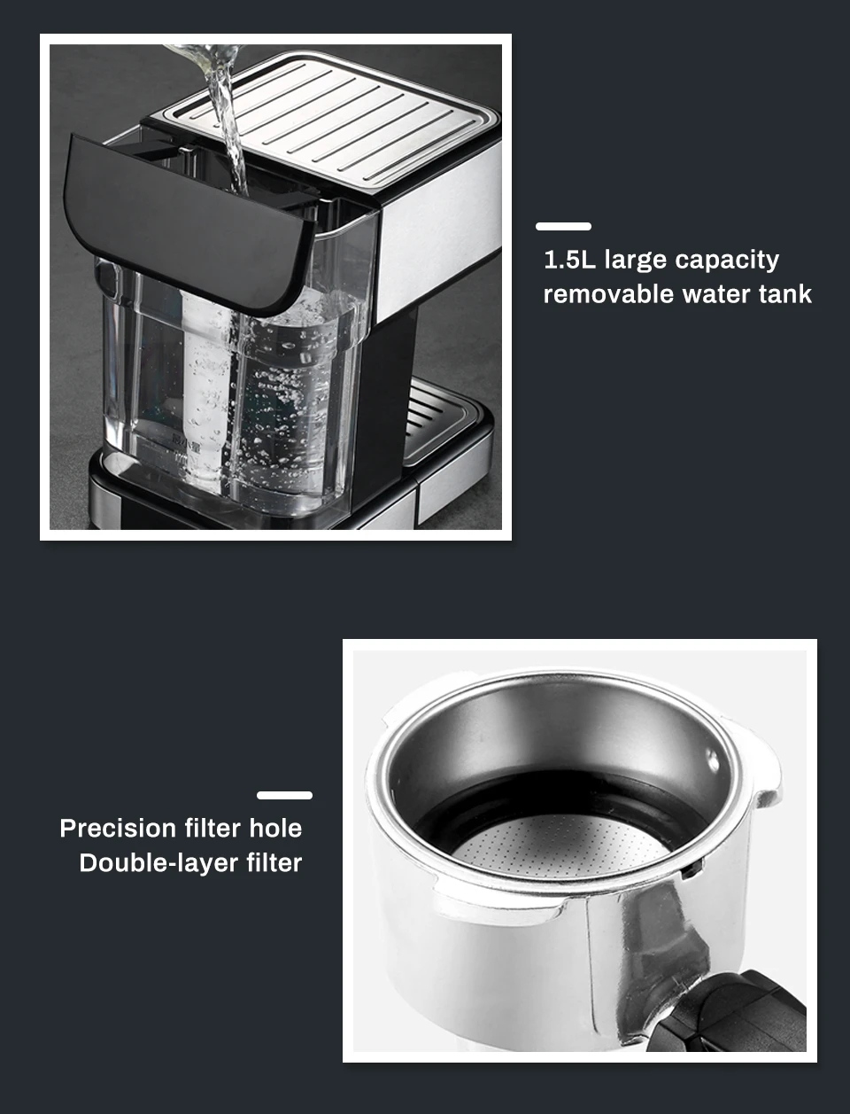 - Käytännölliset yksityiskohdat: aloitustason tasapohjainen suodatinsuppilo, tarkat suodatinreiät, säädettävä ruostumattomasta teräksestä valmistettu höyryputki, irrotettava tippakaukalo ja automaattinen virrankatkaisu helpottavat käyttöä ja puhdistusta.