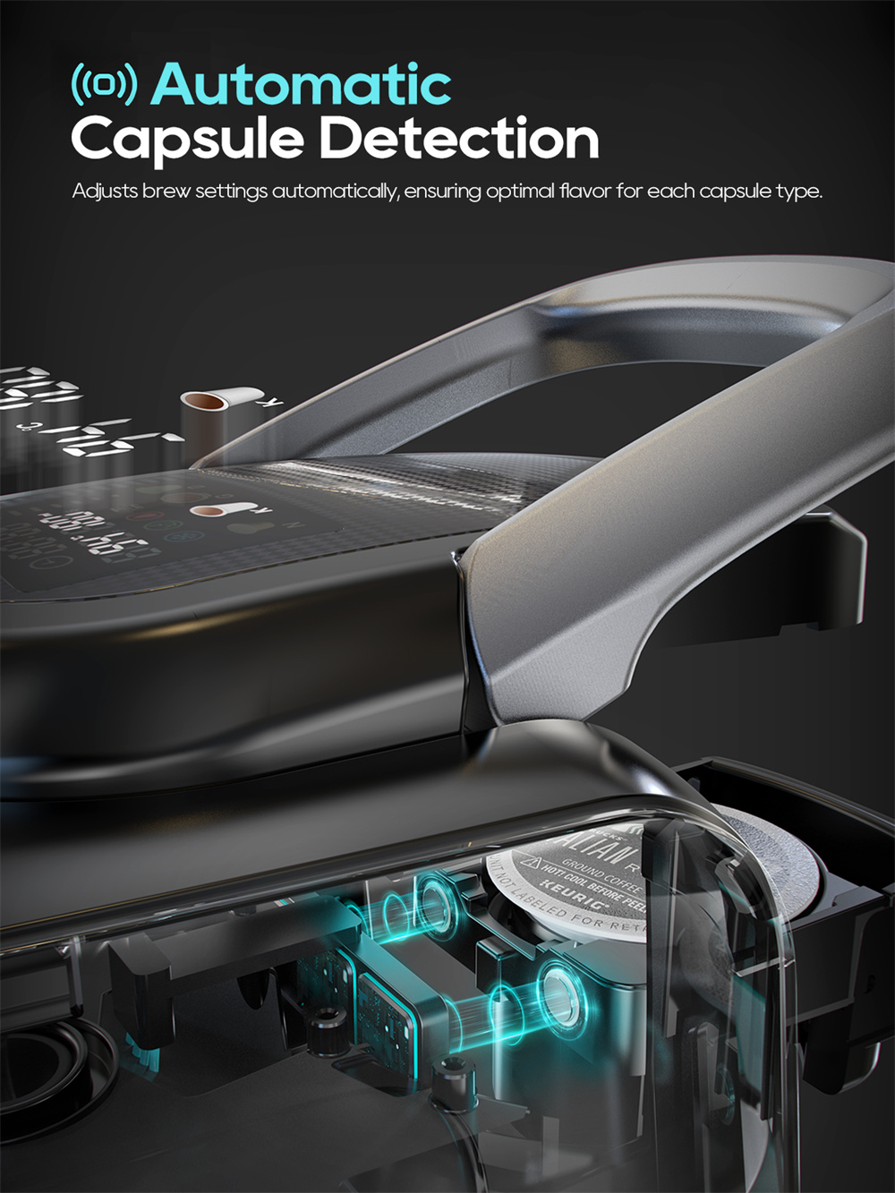Älykäs kapselintunnistus: Laite tunnistaa asetetun kapselin ja säätää uuttoasetukset automaattisesti, jotta maku pysyy tasaisena ilman käsisäätöä.