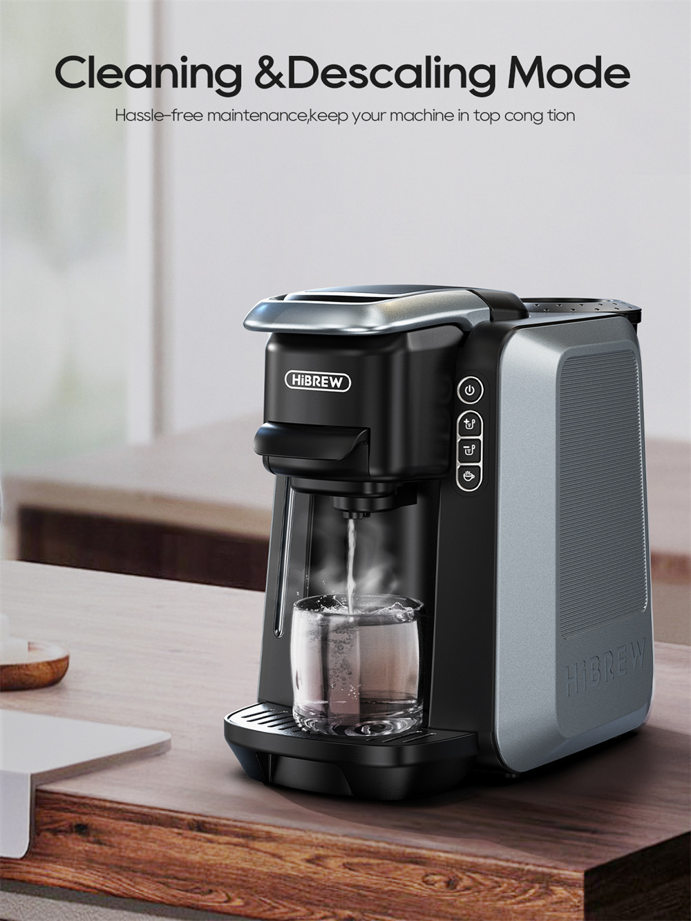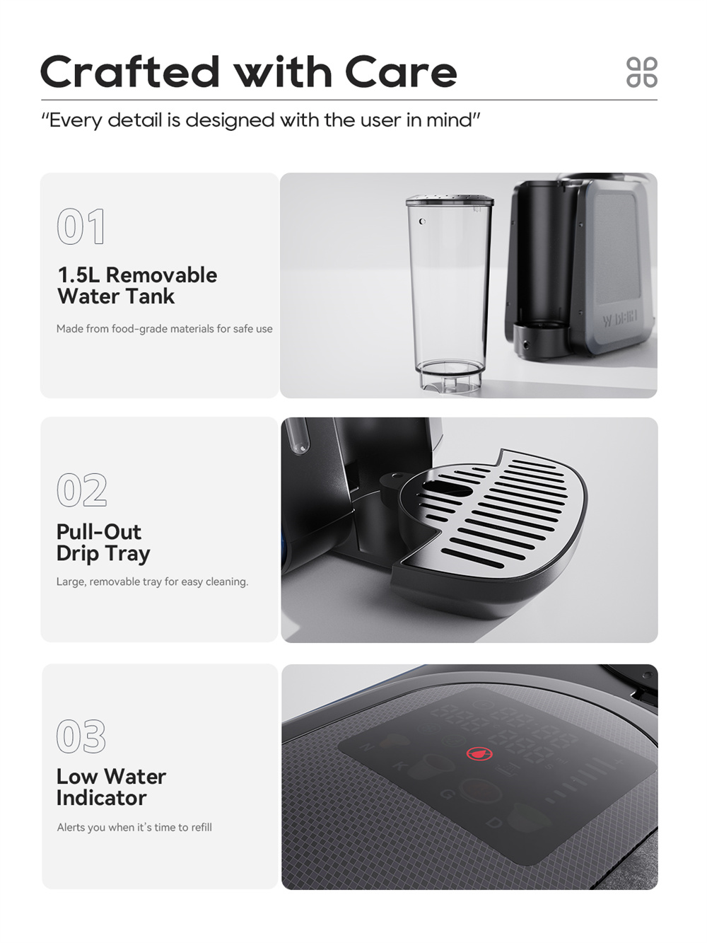 - Helppo ylläpito: 1.5 l vesisäiliö, irrotettava tippakaukalo, automaattinen kalkinpoisto ja höyrynpoisto