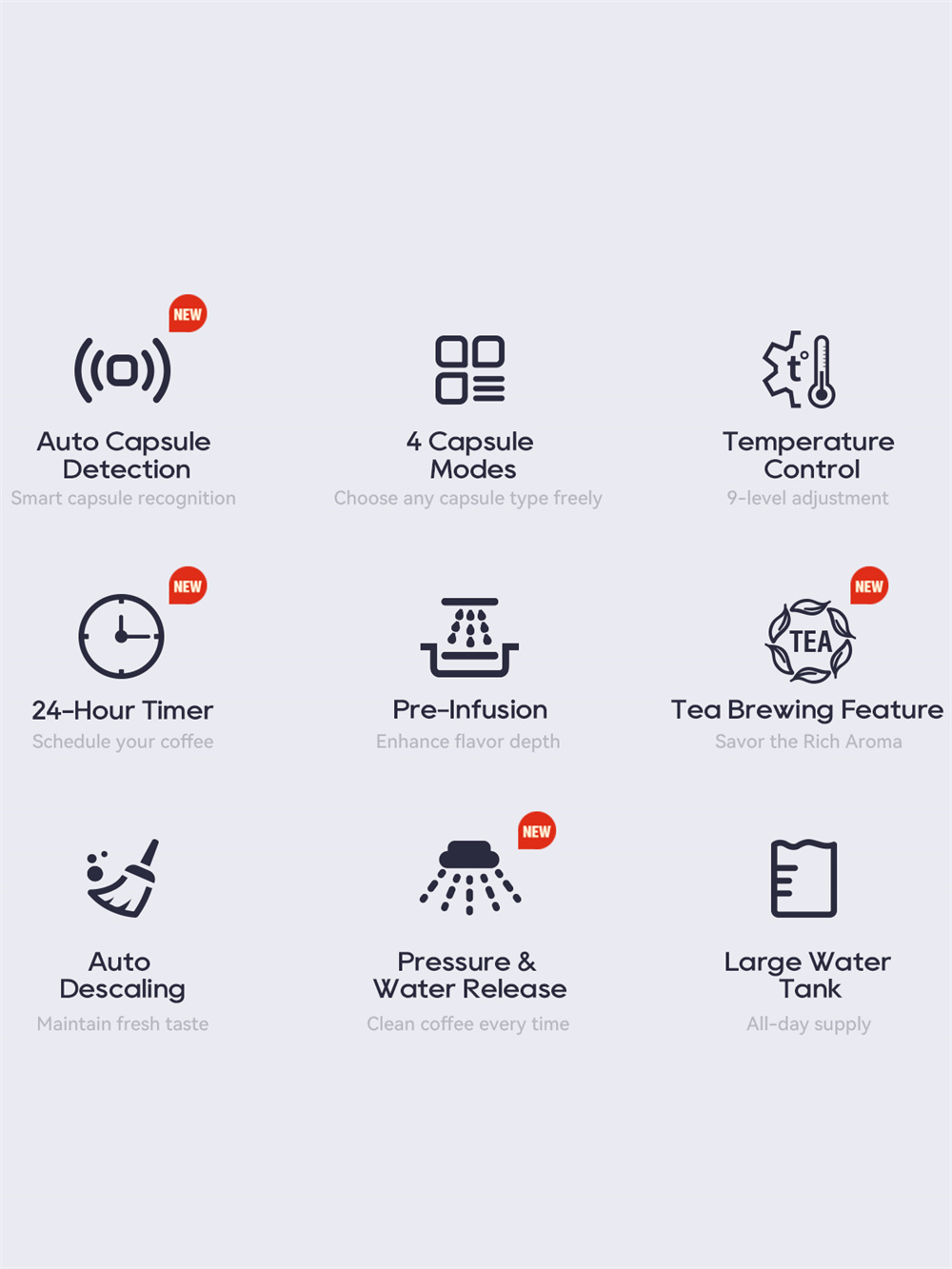- Älykäs kapselintunnistus säätää asetukset automaattisesti kapselityypin mukaan