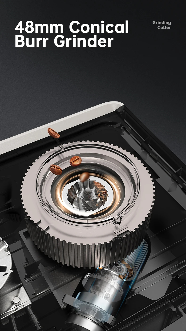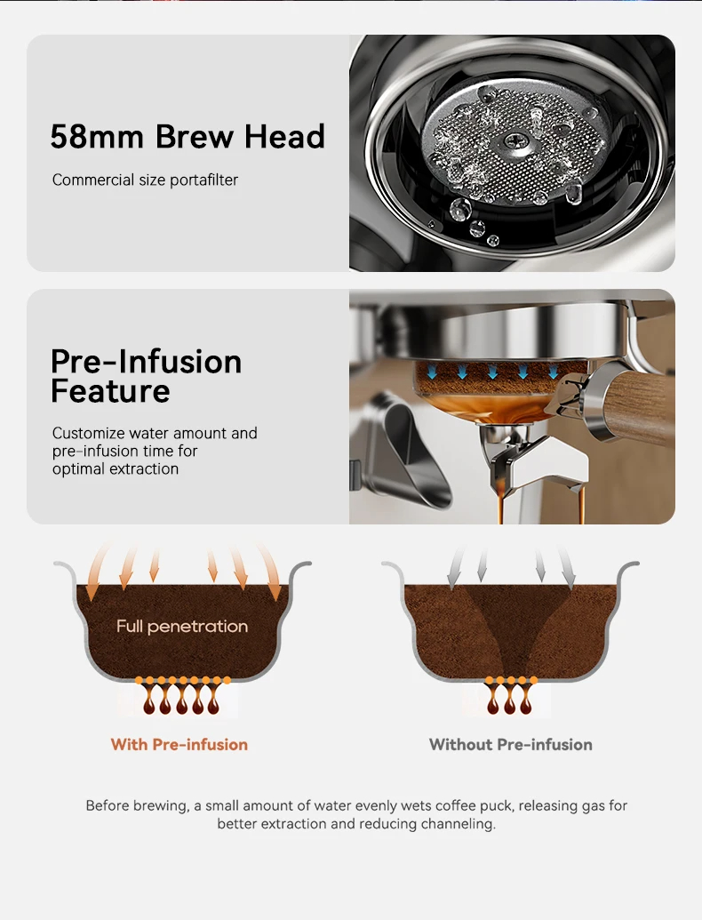 58mm uuttopää, 48mm ruostumattomasta teräksestä valmistettu jauhinterä ja tehokas 2800W höyrysuutin takaavat tasaisen uuton, ripeän höyrytyksen ja silkinpehmeän maidon vaahdon latte-taiteeseen.