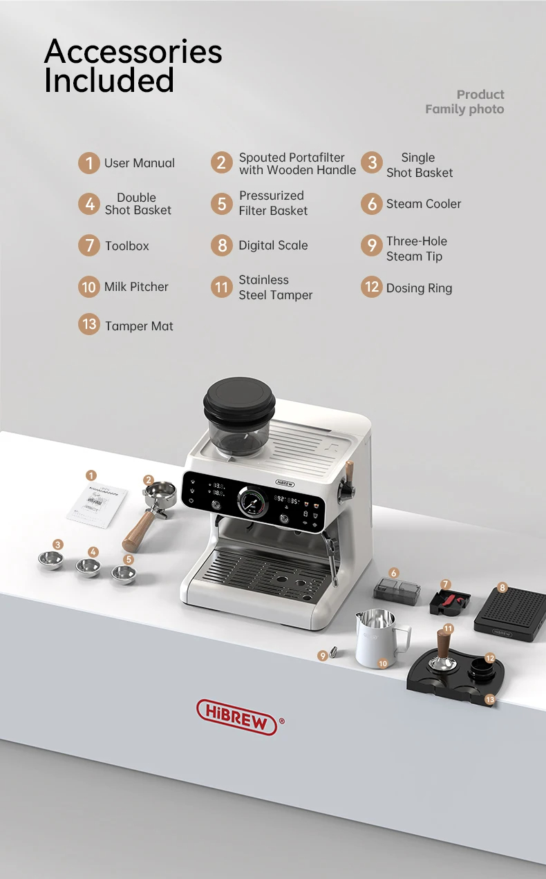 1 x kahvikone 1 x suodatinkahva puukahvalla (spoutattu) 1 x yksöiskori 1 x tuplakori 1 x paineistettu suodatinkori 1 x höyryn jäähdytin 1 x työkalusarja 1 x digitaalinen vaaka 1 x kolmireikäinen höyrysuutinpää 1 x maitokannu 1 x ruostumattomasta teräksestä valmistettu tamper 1 x annostelurengas 1 x tamper-alusta 1 x käyttöopas |