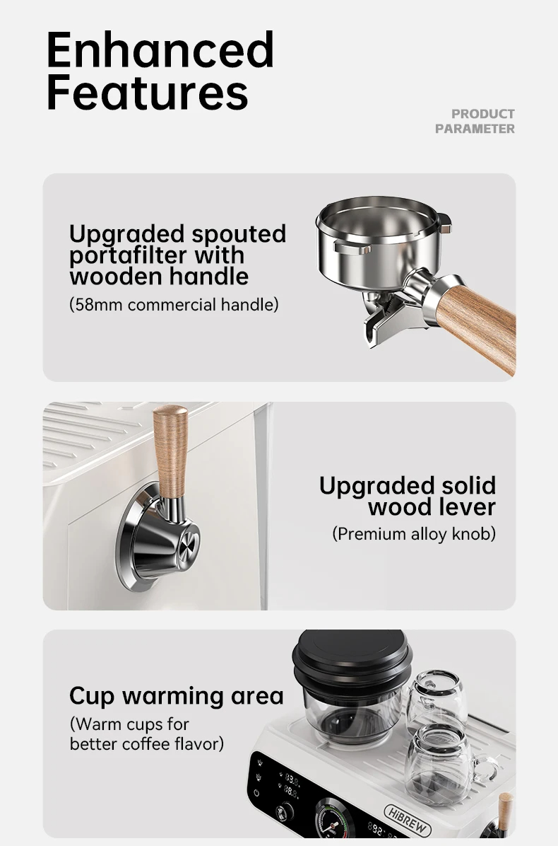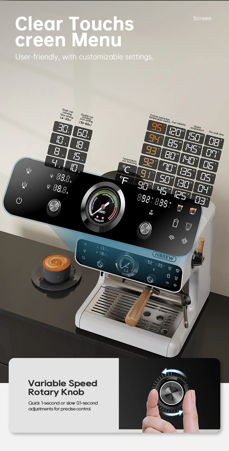 HiBREW H7B on kompakti kotibaristan ratkaisu: sisäänrakennettu 250g papusäiliö ja 30-tasoinen kartioterämylly tuottavat tuoreet jauhatukset joka kupille. Kaksoislämmitysjärjestelmä mahdollistaa yhtäaikaisen uuton ja vaahdotuksen, ja PID-lämpötilansäätö (7 tasoa) varmistaa tasaisen ja sopivan lämpötilan eri paahtoasteille. Värillinen kosketusnäyttö tekee käytöstä selkeää, ja erillinen kuumavesiulosotto helpottaa teen tai pitkän kahvin (Americano) valmistusta.