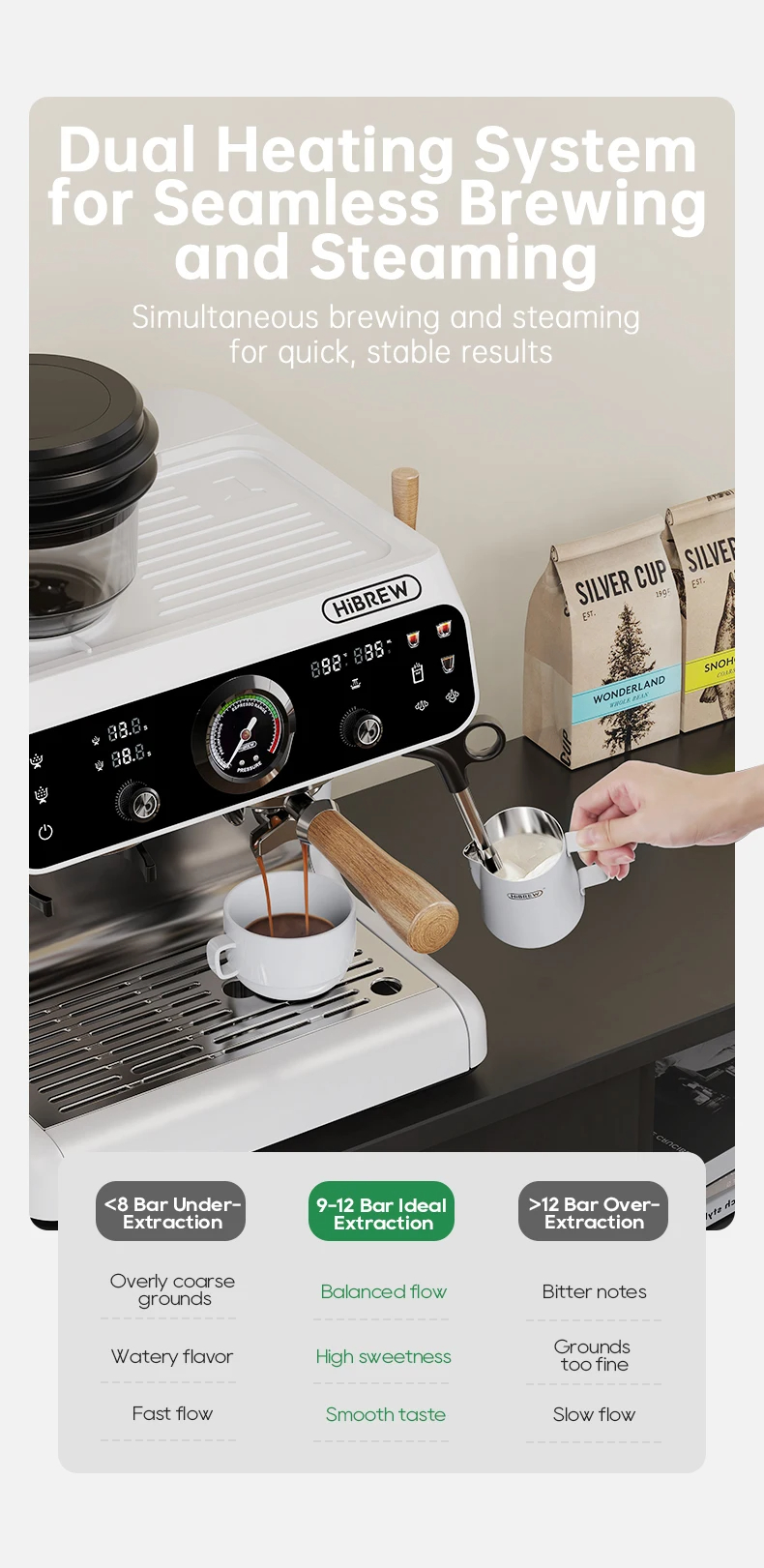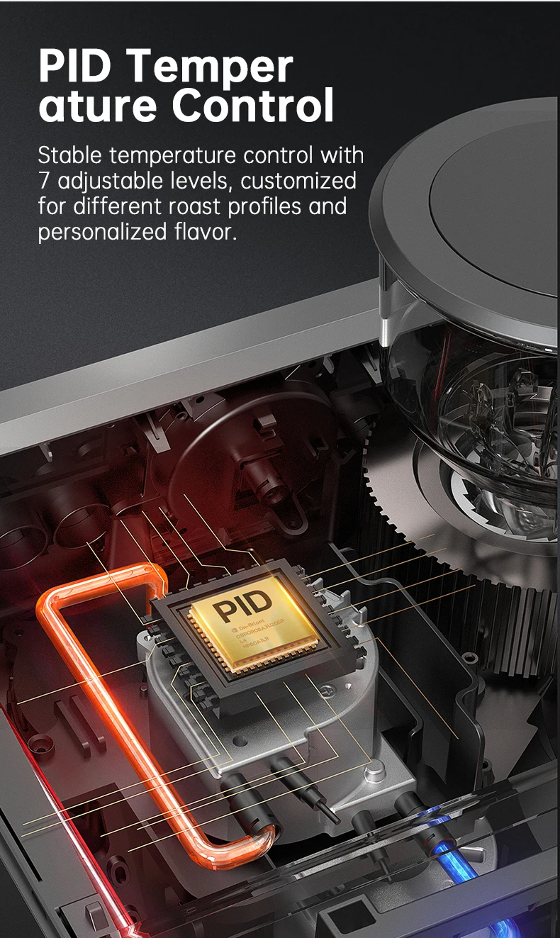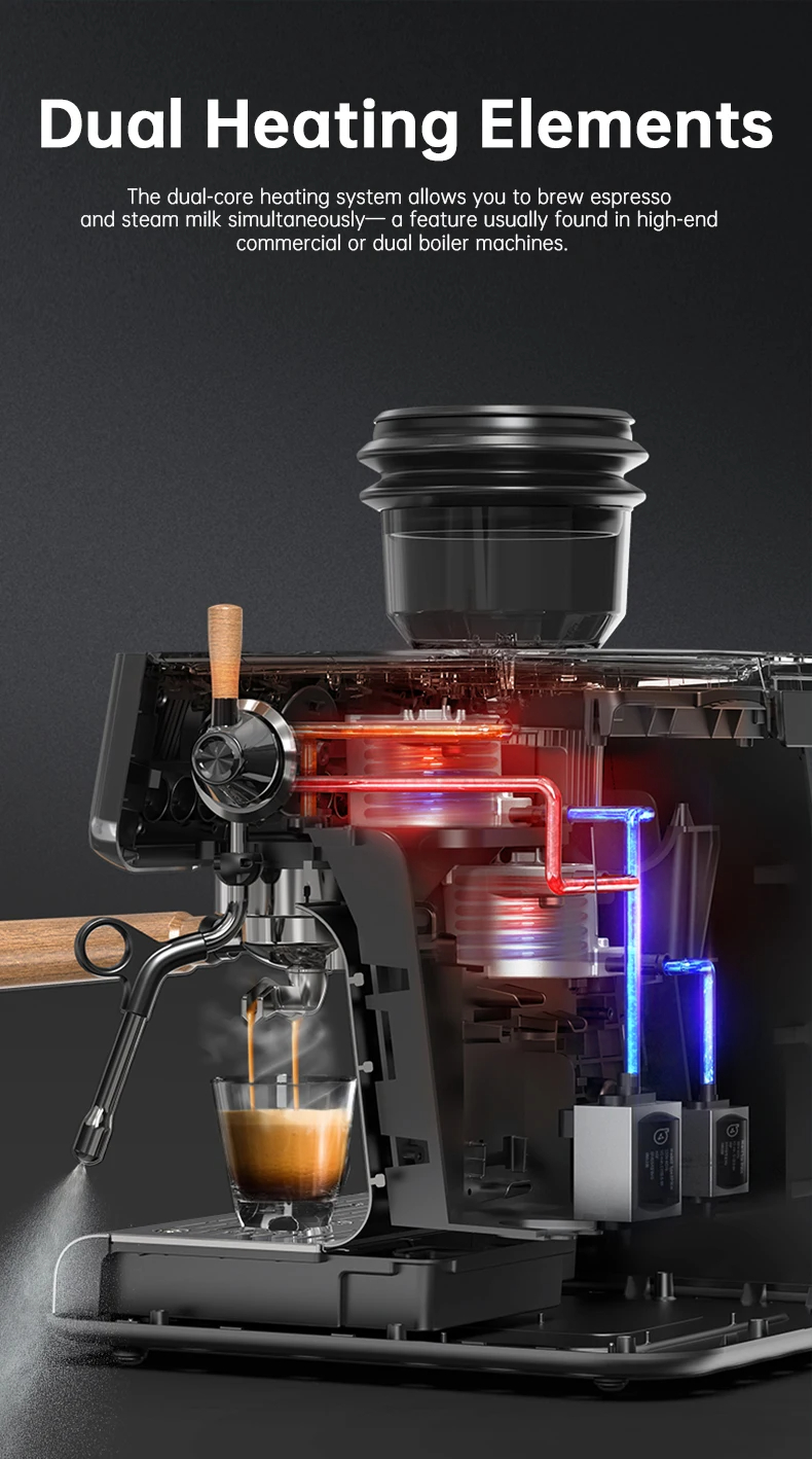 Kaksoislämmitys mahdollistaa samanaikaisen uuton ja vaahdotuksen. PID-säätö tarjoaa 7 säädettävää tasoa uuttolämpötilan hienosäätöön eri paahtoasteille, mikä takaa vakaan ja optimaalisen uuton.