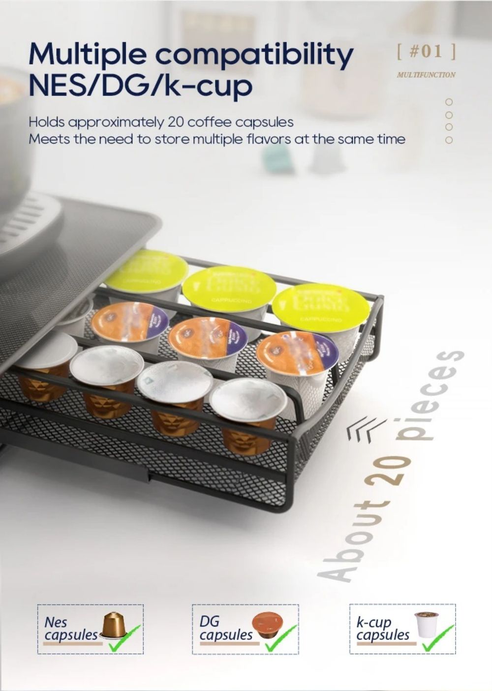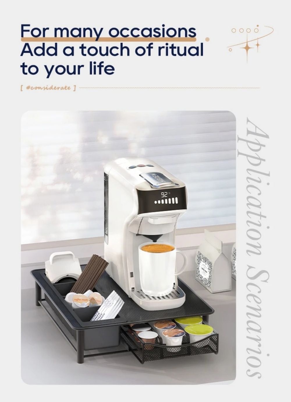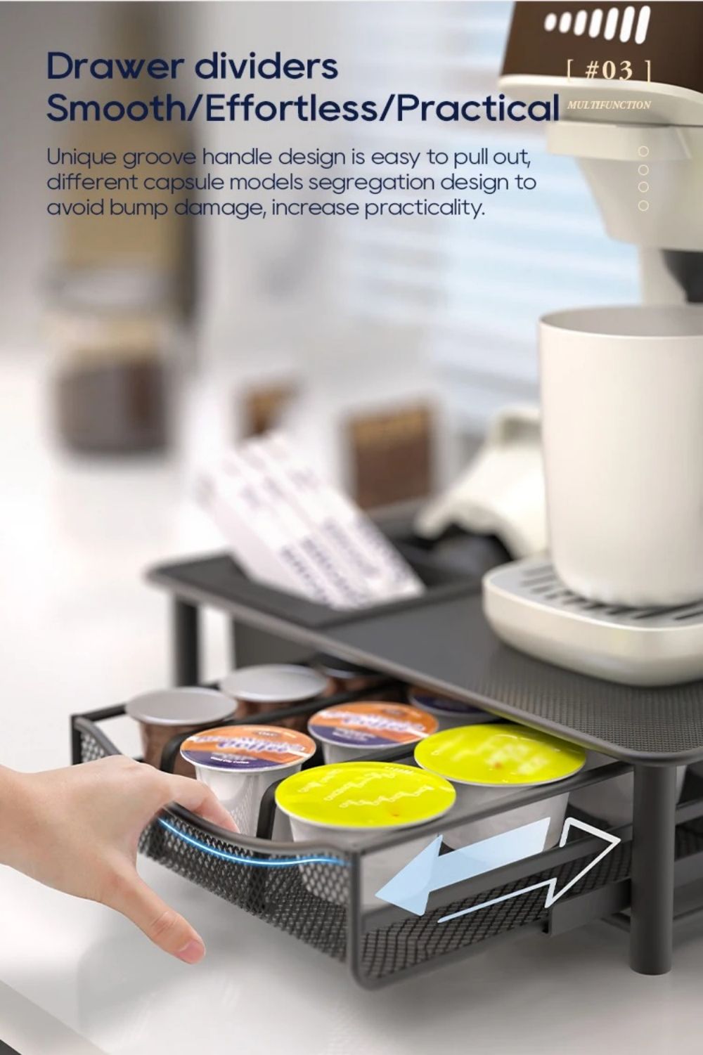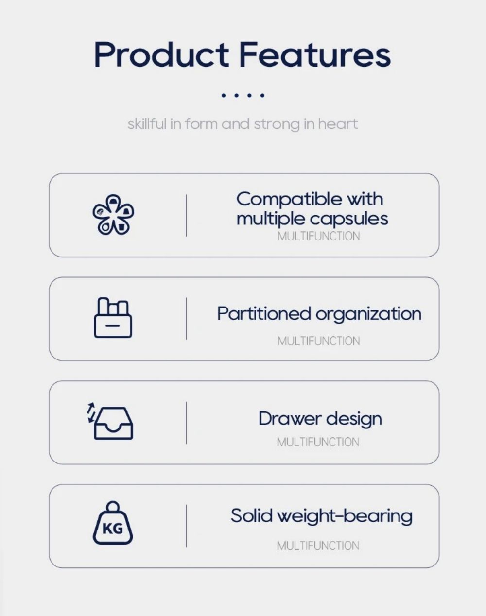 - Vakaa ja luotettava: Kantaa kahvikoneiden, vedenkeittimien tai muiden pienten laitteiden painon ja pitää kapselit järjestyksessä. Liukumaton pohja varmistaa pitävän sijoituksen.