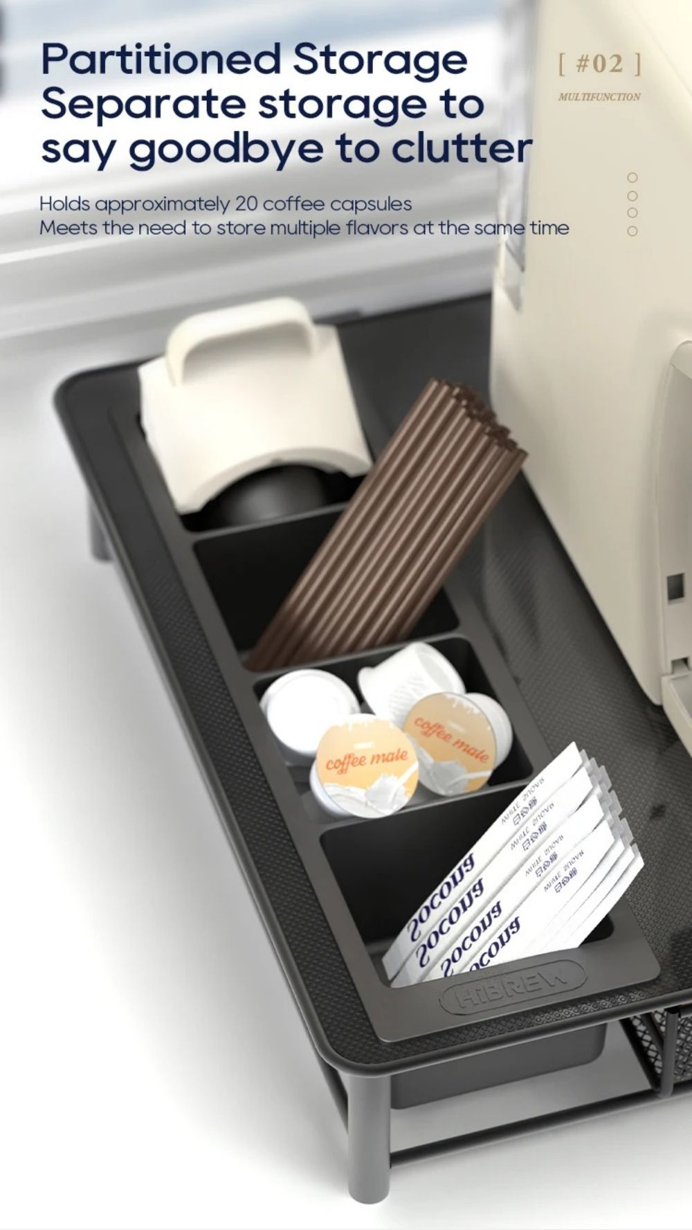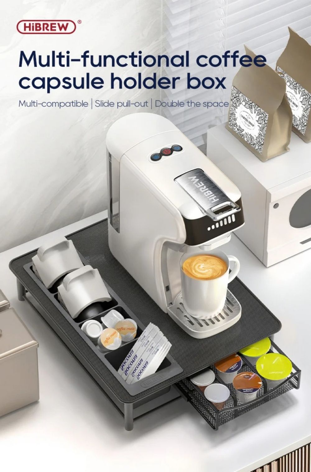 Kompakti ja tukeva kahvikapselien säilytysteline, joka pitää kapselit selkeästi järjestyksessä ja vapauttaa tilaa työtasolta. Sopii käytettäväksi HiBREW H1B/H2B -kahvikoneiden alla sekä muiden pienten laitteiden kanssa.