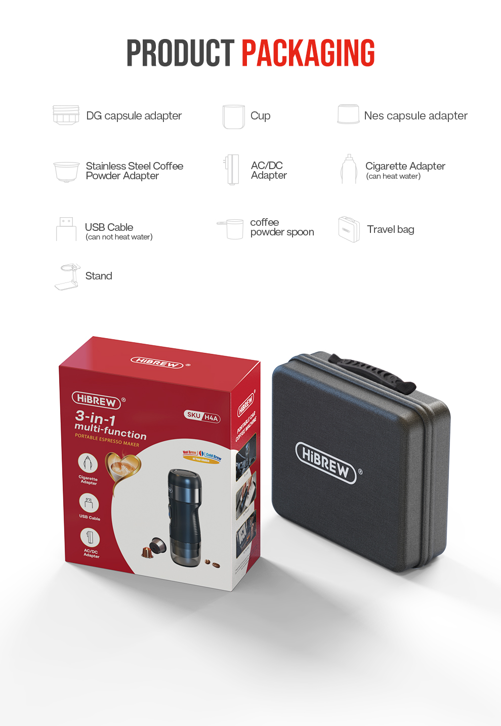 Lahjapakkaus: 1 x kahvinkeitin, 1 x DG-kapselisovitin, 1 x Nes-kapselisovitin, 1 x ruostumattomasta teräksestä valmistettu kahvijauhadapteri, 1 x AC/DC-sovitin, 1 x autoadapteri (voi kuumentaa vettä), 1 x USB-kaapeli (ei voi kuumentaa vettä), 1 x kahvijauhemitta, 1 x kuppi, 1 x käyttöohje Matkapakkaus: 1 x kahvinkeitin, 1 x DG-kapselisovitin, 1 x Nes-kapselisovitin, 1 x ruostumattomasta teräksestä valmistettu kahvijauhadapteri, 1 x AC/DC-sovitin, 1 x autoadapteri (voi kuumentaa vettä), 1 x USB-kaapeli (ei voi kuumentaa vettä), 1 x kahvijauhemitta, 1 x kuppi, 1 x kantolaukku, 1 x teline, 1 x käyttöohje |