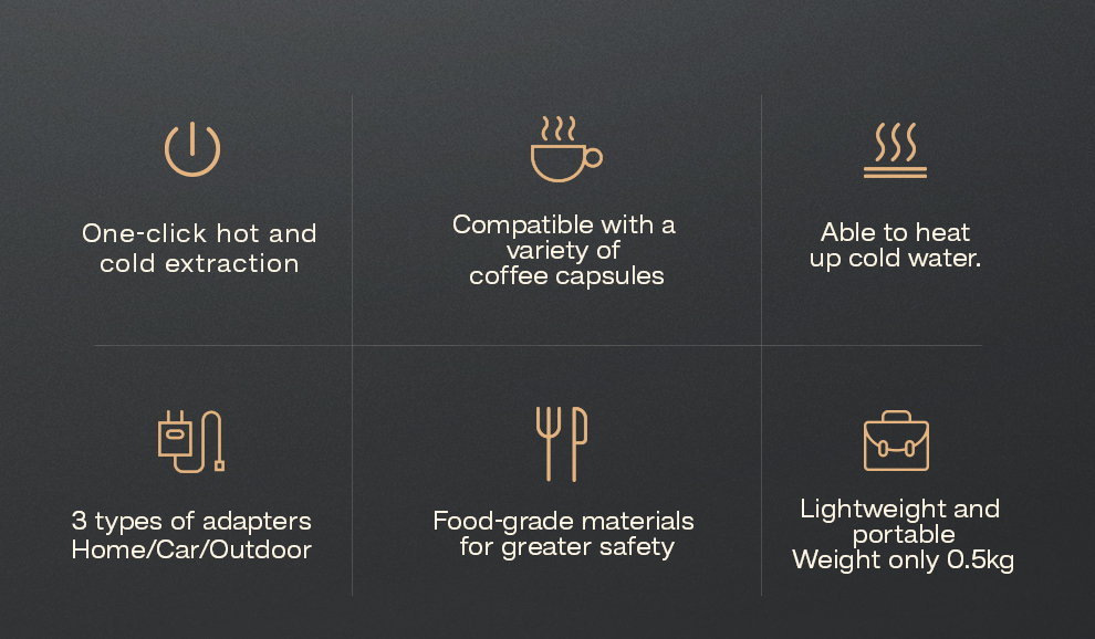 Kompakti ja kannettava espressokeitin autoihin, matkalle ja kotiin. Yhden painikkeen kuuma- tai kylmäuutto, 15Bar paine ja yhteensopivuus NES- ja DG-kapseleiden sekä jauhetun kahvin kanssa.