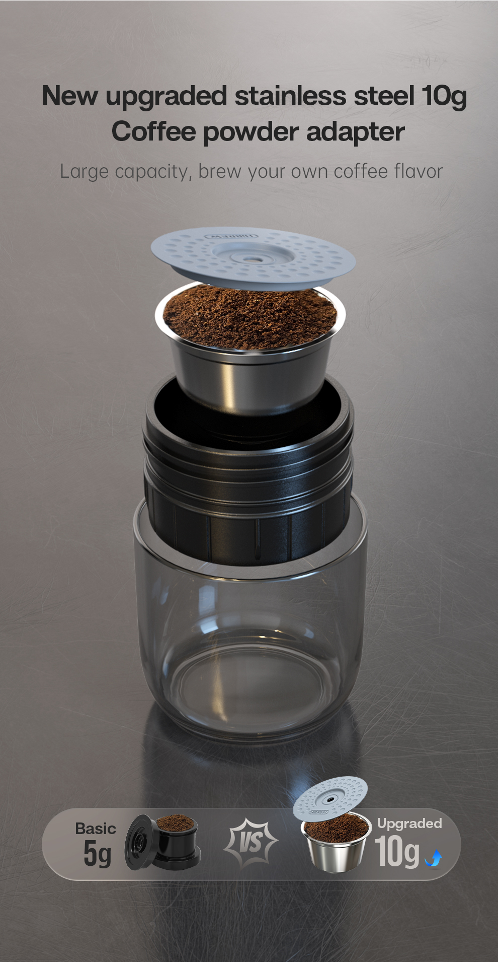 - Uudistettu ruostumattomasta teräksestä valmistettu 10g kahvijauhadapteri: suurempi kapasiteetti oman kahvimakun kehittämiseen.