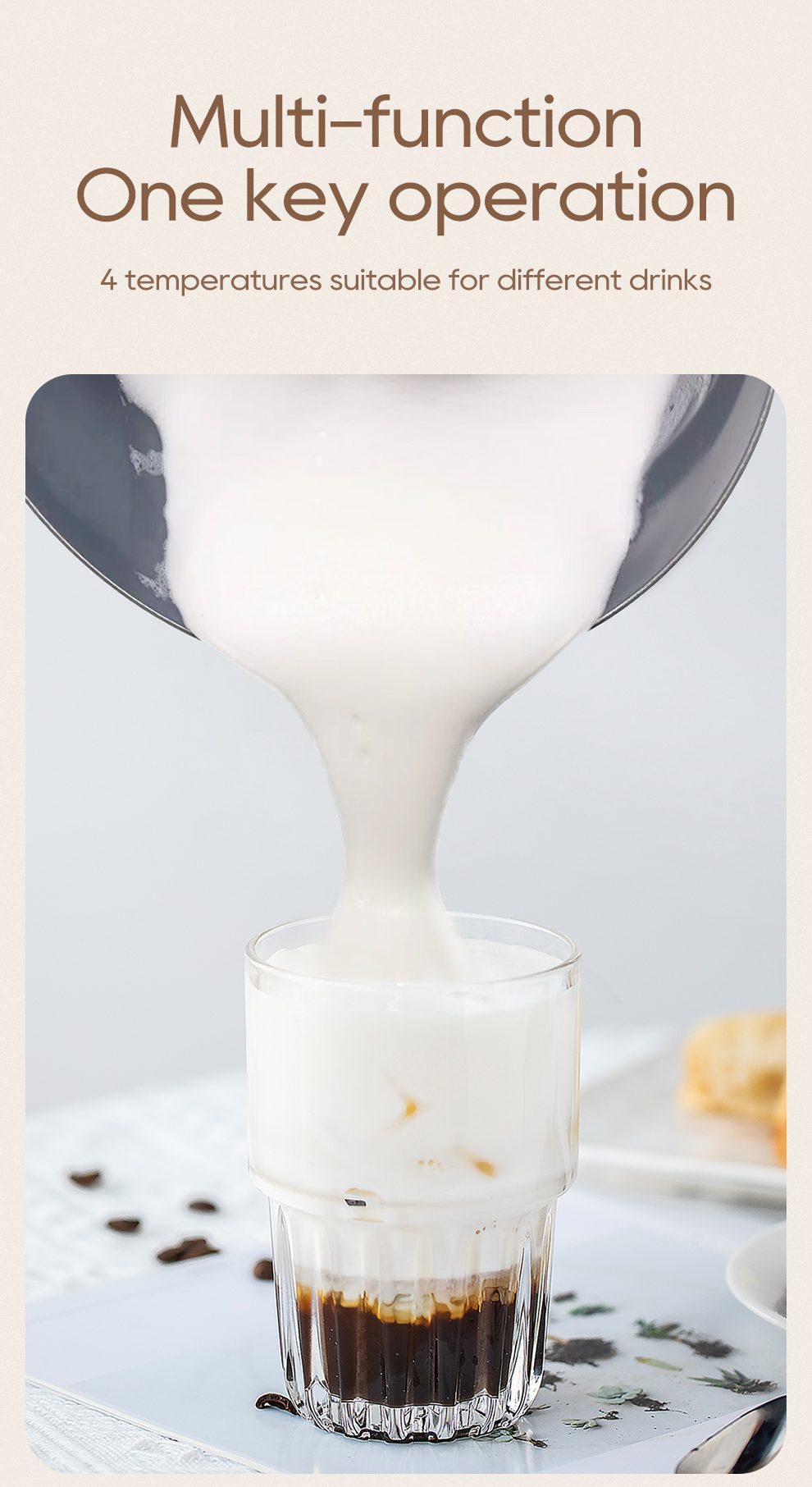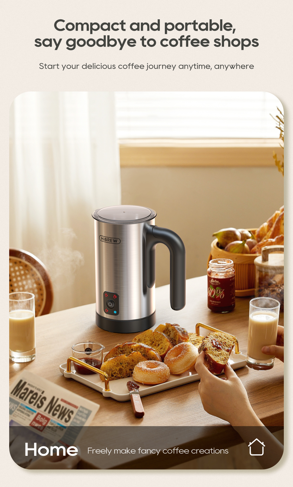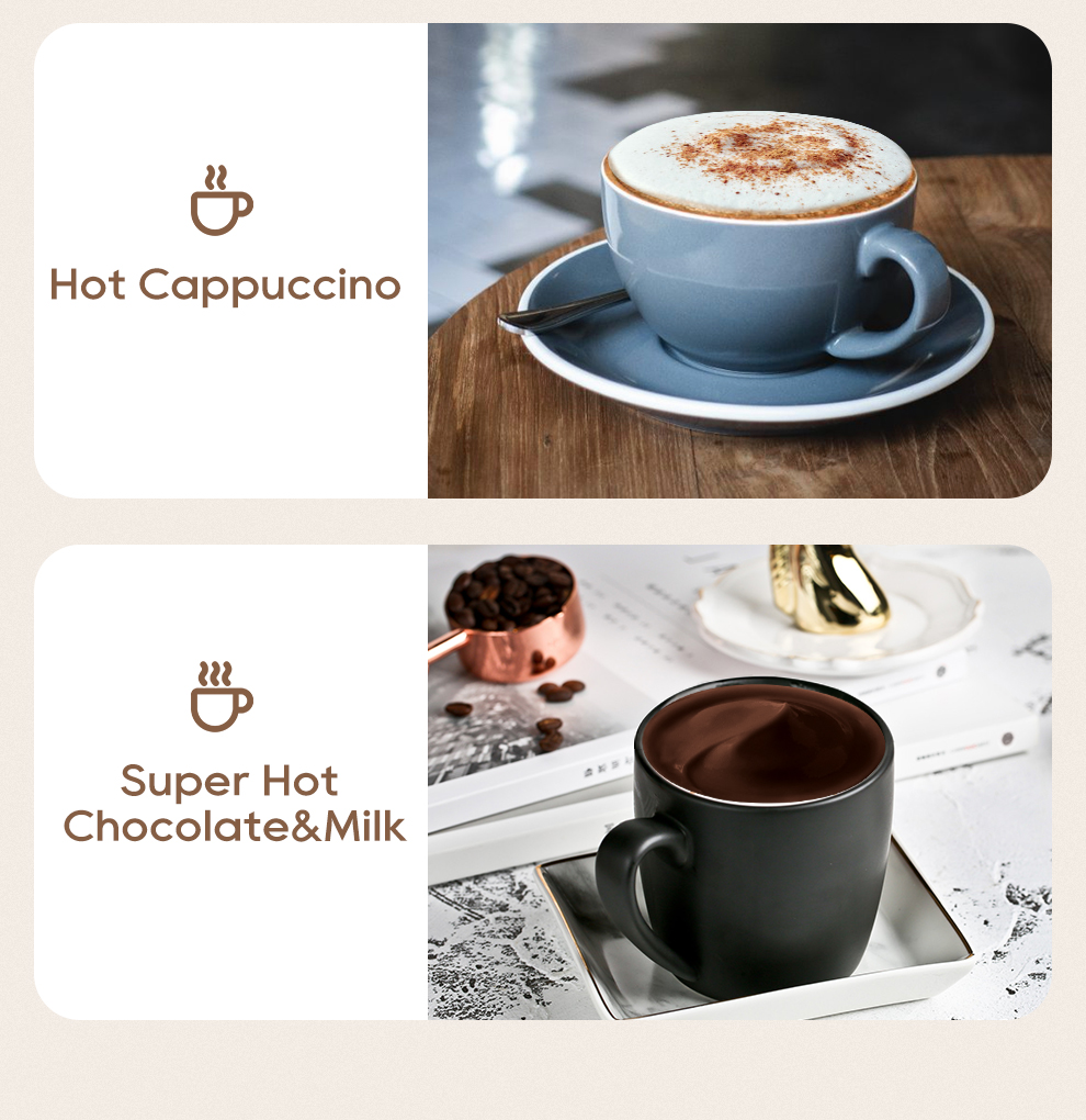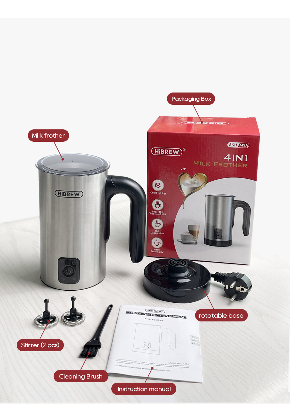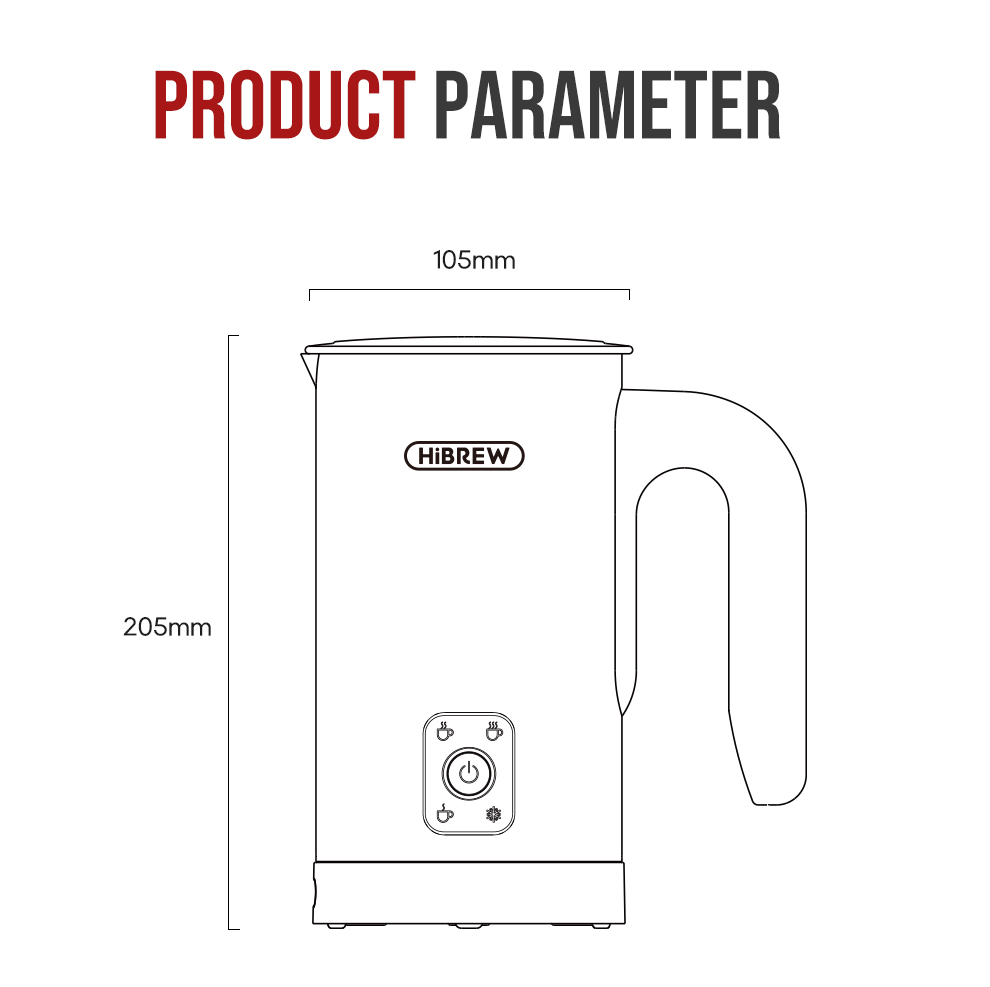 Brändi: HiBREW Malli: M3A Nimellisteho: 450 W Nimellisjännite: vaihtovirta (AC) 220–240V 50/60Hz Kapasiteetti: vaahdotus – enintään 130 ml, lämmitys ja sekoitus – enintään 300 ml |