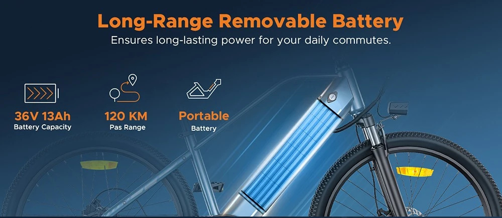 - 13Ah / 36V litiumioniakku (sisältyy tuotteeseen) jopa 120km toimintamatkaan PAS-tilassa.