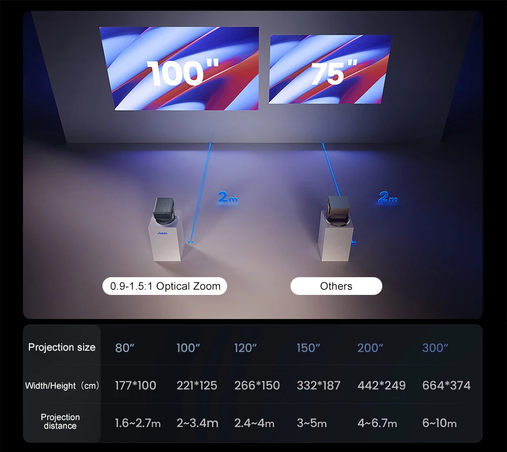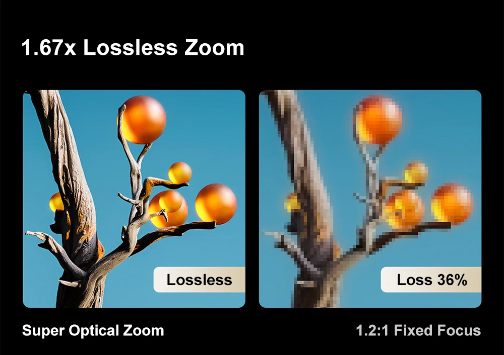 1. Tehokas optinen zoom: heittosuhde 0.9-1.5:1 ja 1.67x häviötön zoomaus.