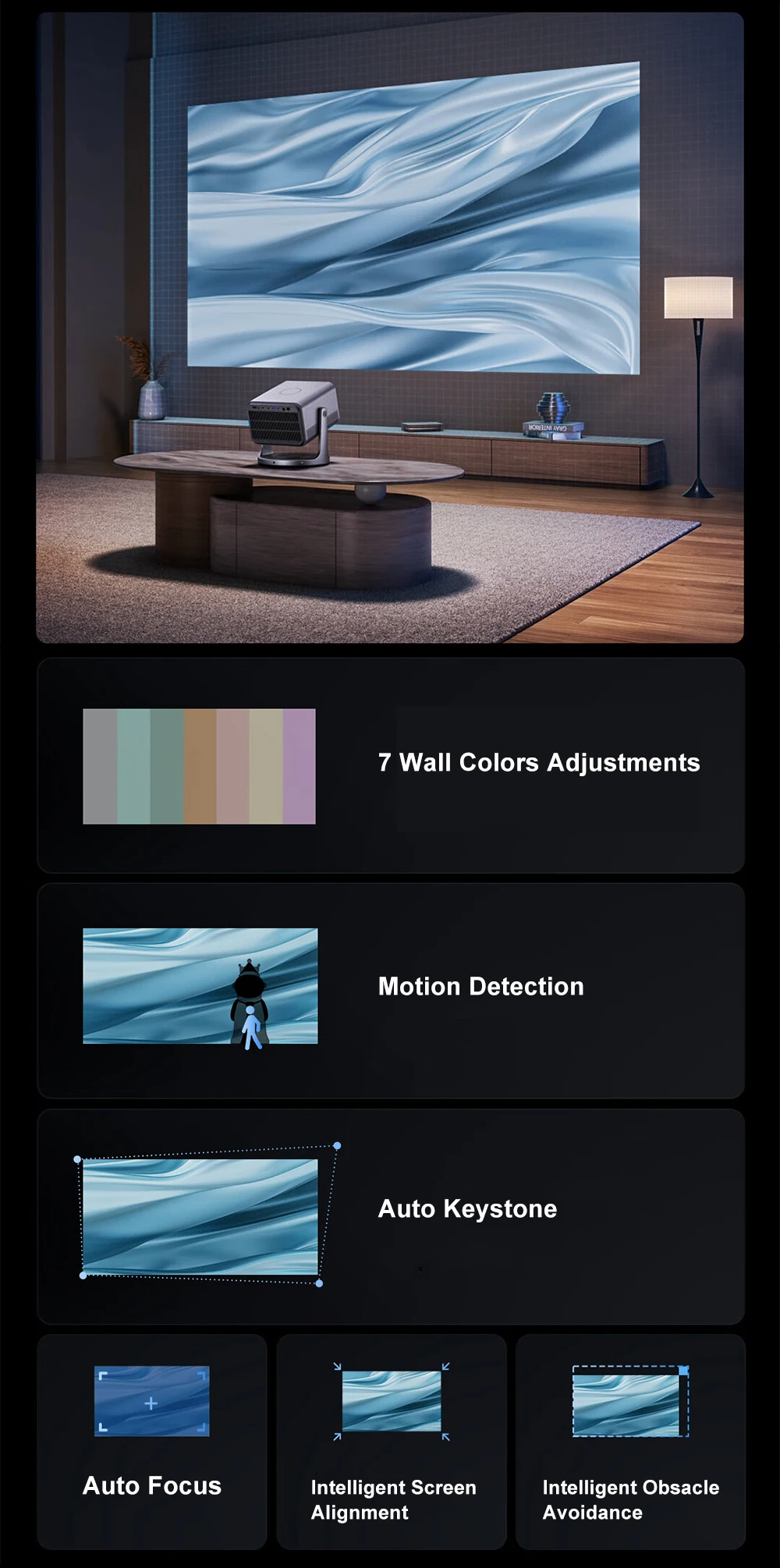 5. Älykotiyhteensopivuus: AI-ääniohjaus, esteiden väistö ja automaattinen kuvansovitus.