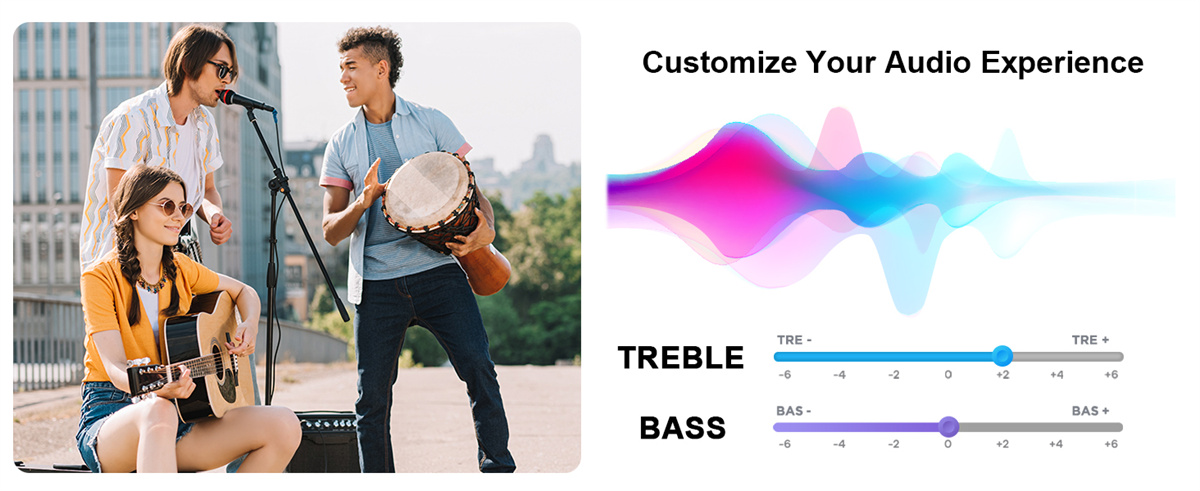 3. Muokattava ääni: 12-tasoinen diskantin ja basson säätö sekä kolme EQ-tilaa (Musiikki, Elokuva, Uutiset) eri sisältöjen optimointiin.