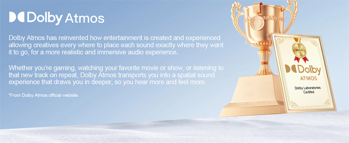 1. Dolby Atmos ja 3D-tilaääni: Tarjoaa vaikuttavan kolmiulotteisen äänimaailman elokuvamaisia kuunteluelämyksiä varten.