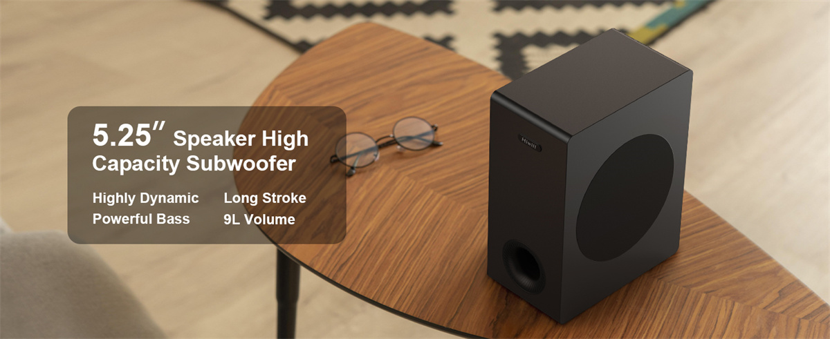 2. Ulkoinen 5.25-tuumainen subwoofer: Pitkän iskunpituuden rakenne ja kehittynyt värähtelykapasiteetti tuottavat voimakkaan basson.