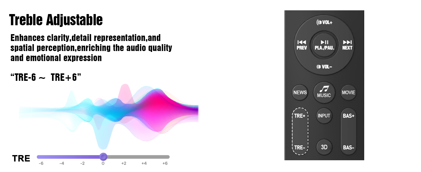 - Säädettävä basso ja diskantti: 12 tasoa basson ja diskantin säätöä sekä erilliset taajuuskorjaintilat (Musiikki, Elokuva, Uutiset).