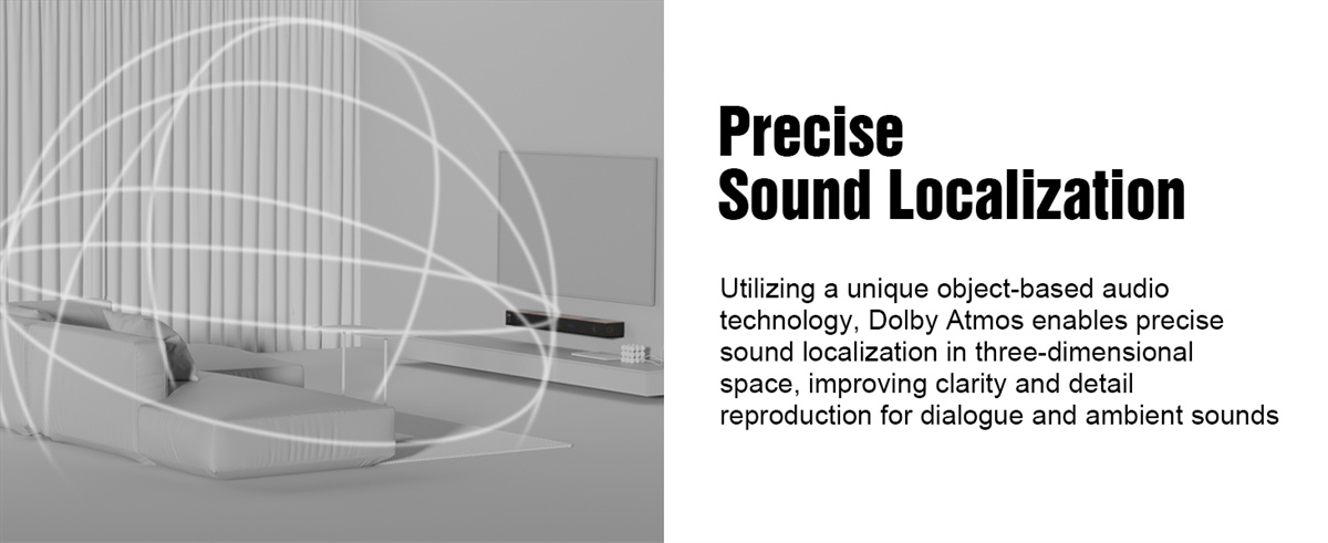- 360° tilaääni: Tarkka äänien paikannus, kirkas ylätaajuuksien toisto ja laajennettu äänikenttä syvempään upotukseen.