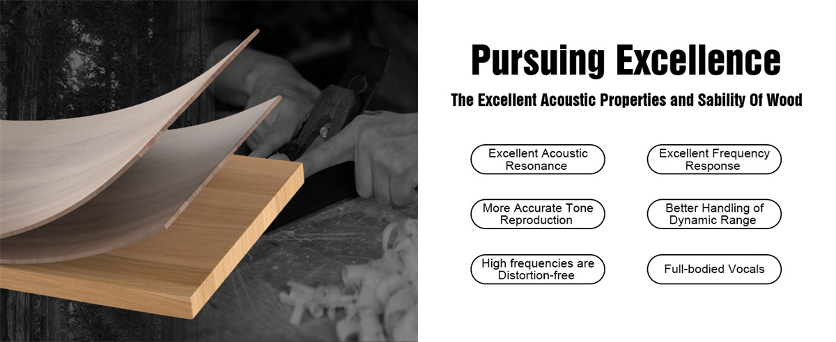 - Puun akustiset edut: Luonnollinen resonanssi parantaa matalien taajuuksien toistoa ja selkeyttä myös korkeilla äänenvoimakkuuksilla.