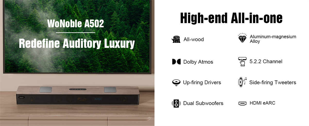 Hiwill A502 hyödyntää puun akustisia etuja ja 5.2.2-kanavaista kokoonpanoa tarjoten selkeän äänen ja laajan tilaäänikokemuksen elokuville ja musiikille.