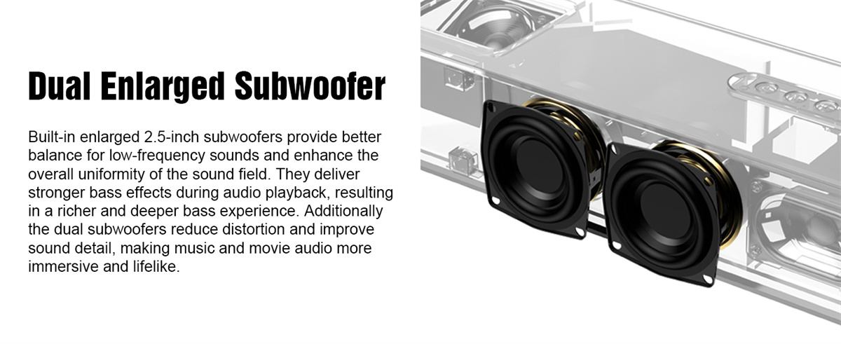 - Kaksi sisäänrakennettua bassokaiutinta: Kaksi 2.5-tuumaiset bassokaiutinta tuottavat syvän basson vähäisellä säröllä musiikkiin ja elokuviin.