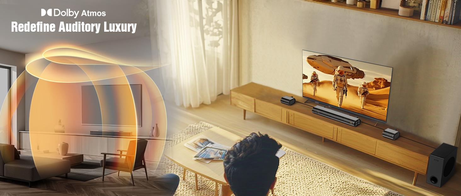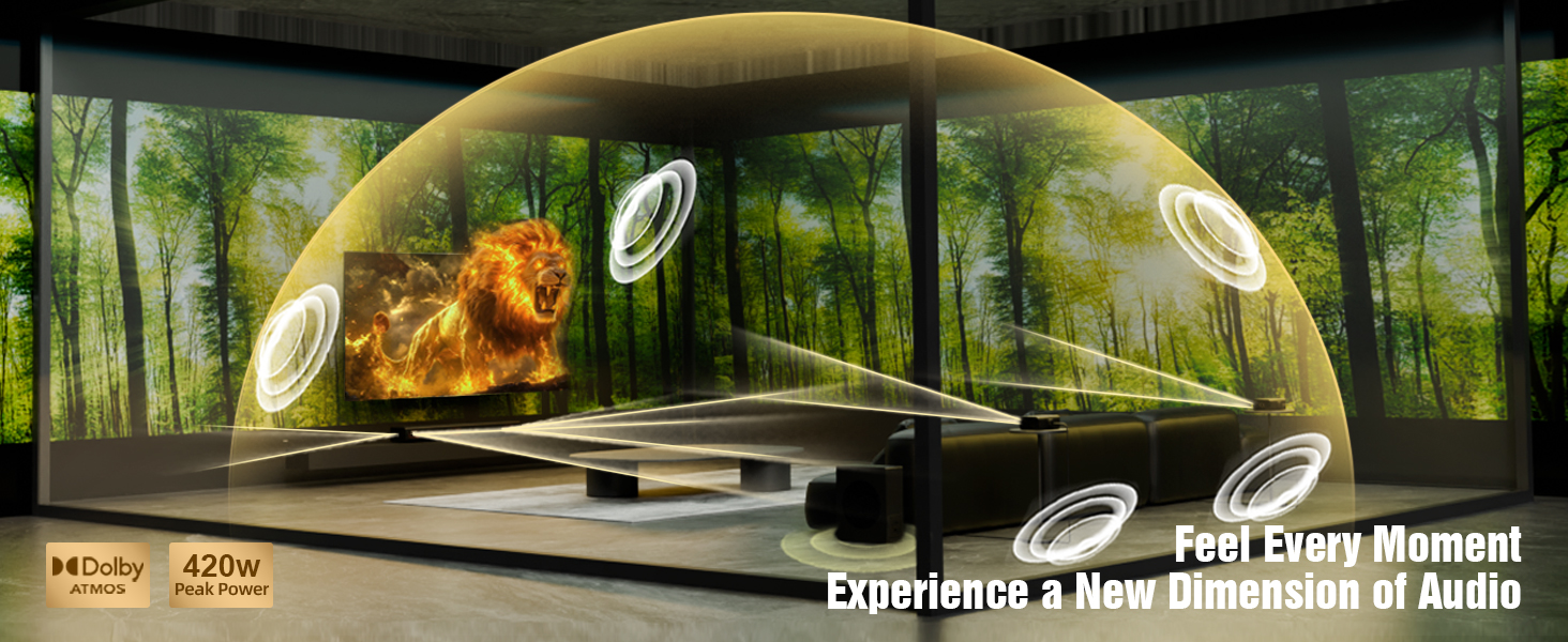 Koe elävä 3D-ääni Dolby Atmos -teknologialla, joka muuttaa kotisi moniulotteiseksi elokuvateatteriksi. Se tuottaa tarkan äänen sijoittumisen ja dynaamisen äänimaailman.