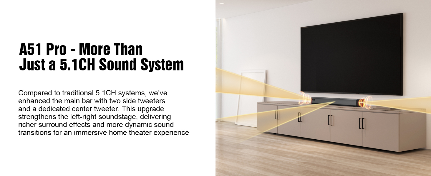 Toisin kuin tavallisissa 5.1CH-järjestelmissä, A51 Pro sisältää kaksi johdollista surround-kaiutinta ja lisäelementtejä moniulotteista ääntä varten. Se parantaa äänen realismia, jolloin elokuvat ja musiikki tuntuvat elävämmiltä ja mukaansatempaavilta.