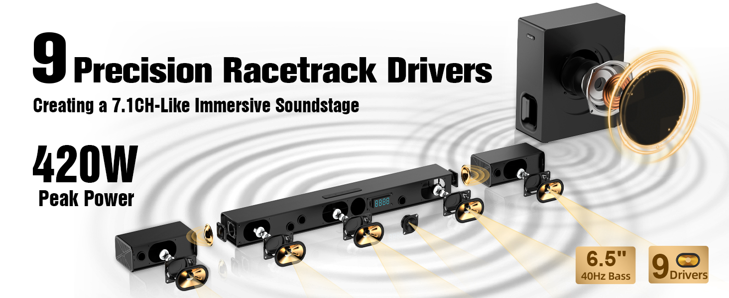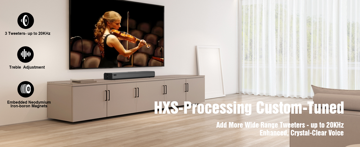 Racetrack-elementit ja HXS ClearVoice -tekniikka varmistavat selkeän puheen, vahvemman basson ja hienosäädetyt keskitaajuudet tasapainoiseen, teatteritasoiseen äänikenttään.