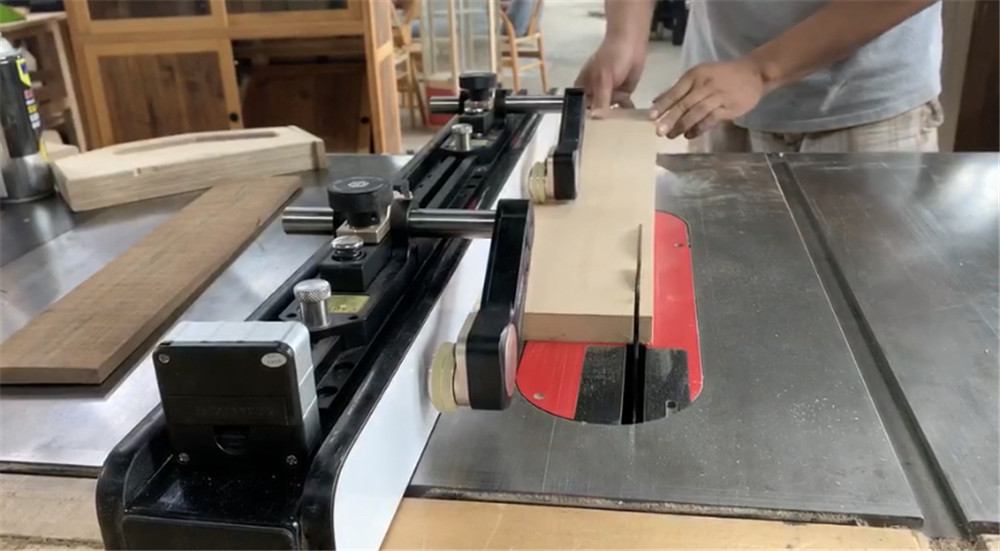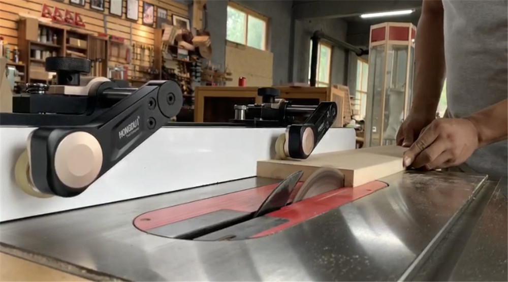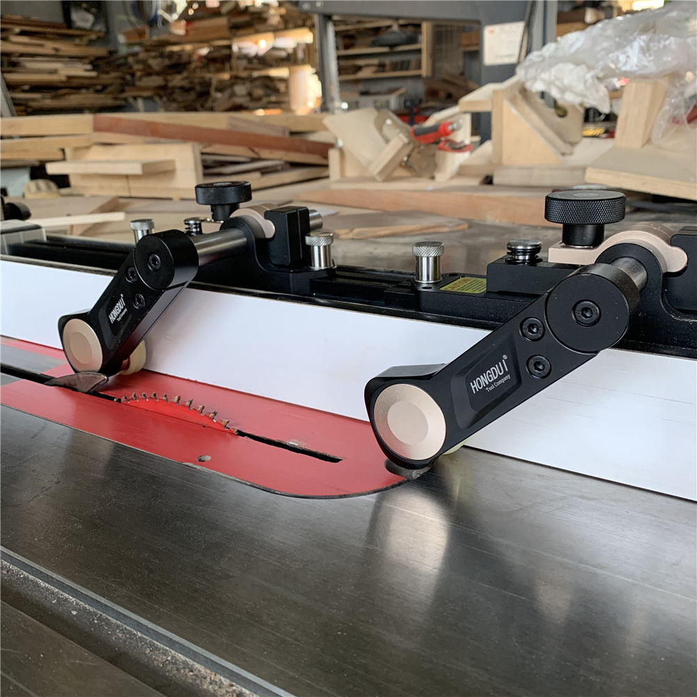 HONGDUI Woodworking Assembly Table Saw Clear Cut Press Stock Push Guide -työntöohjain parantaa pöytäsahan turvallisuutta ja tarkkuutta. Jousikuormitteiset rullat pitävät työkappaleen tukevasti aitaa vasten ja vähentävät takapotkun riskiä, mikä tekee syötöstä tasaisempaa ja hallitumpaa, erityisesti leveiden lankkujen ja suurten paneelien työstössä.