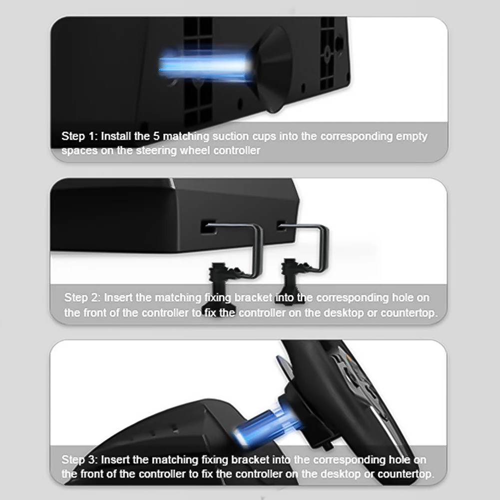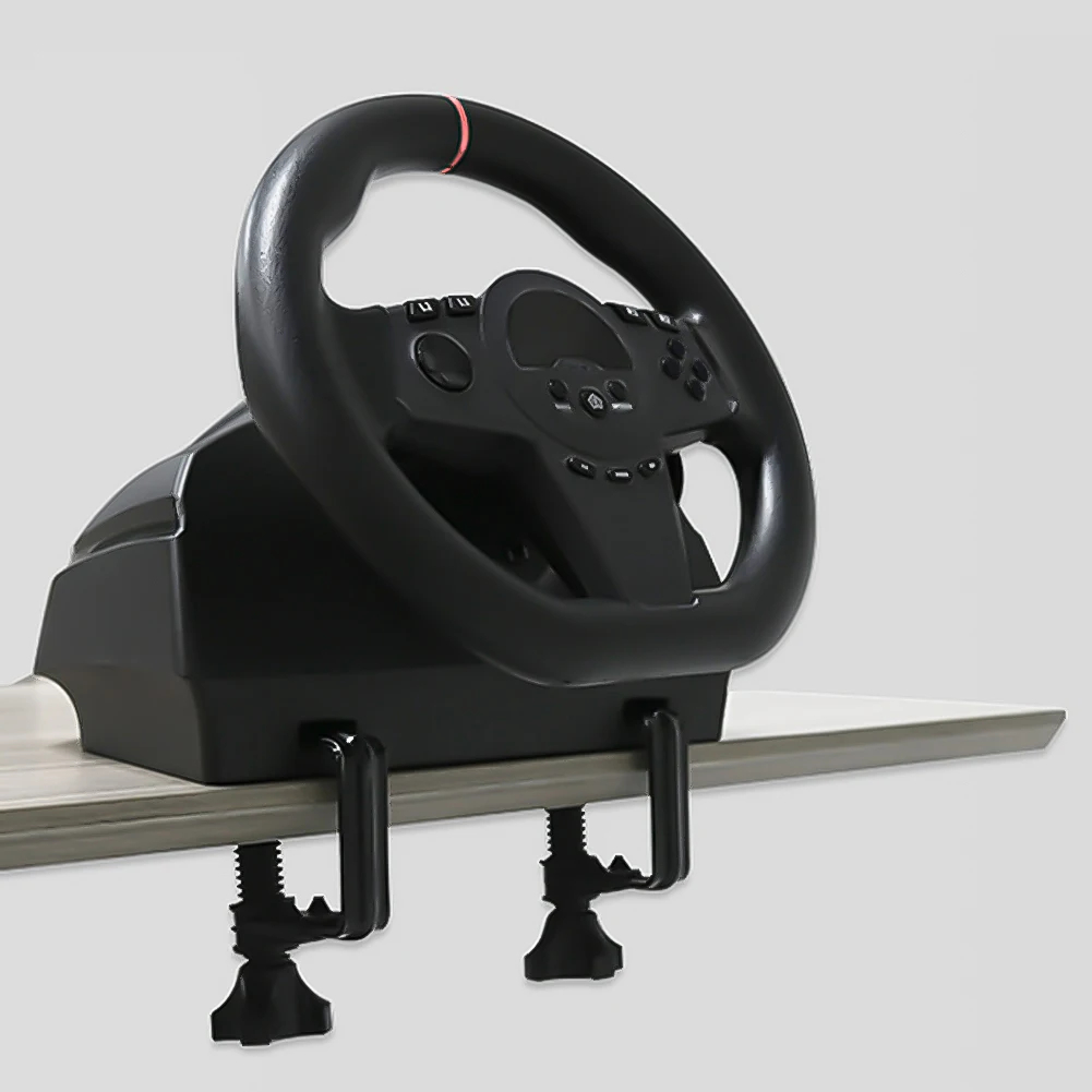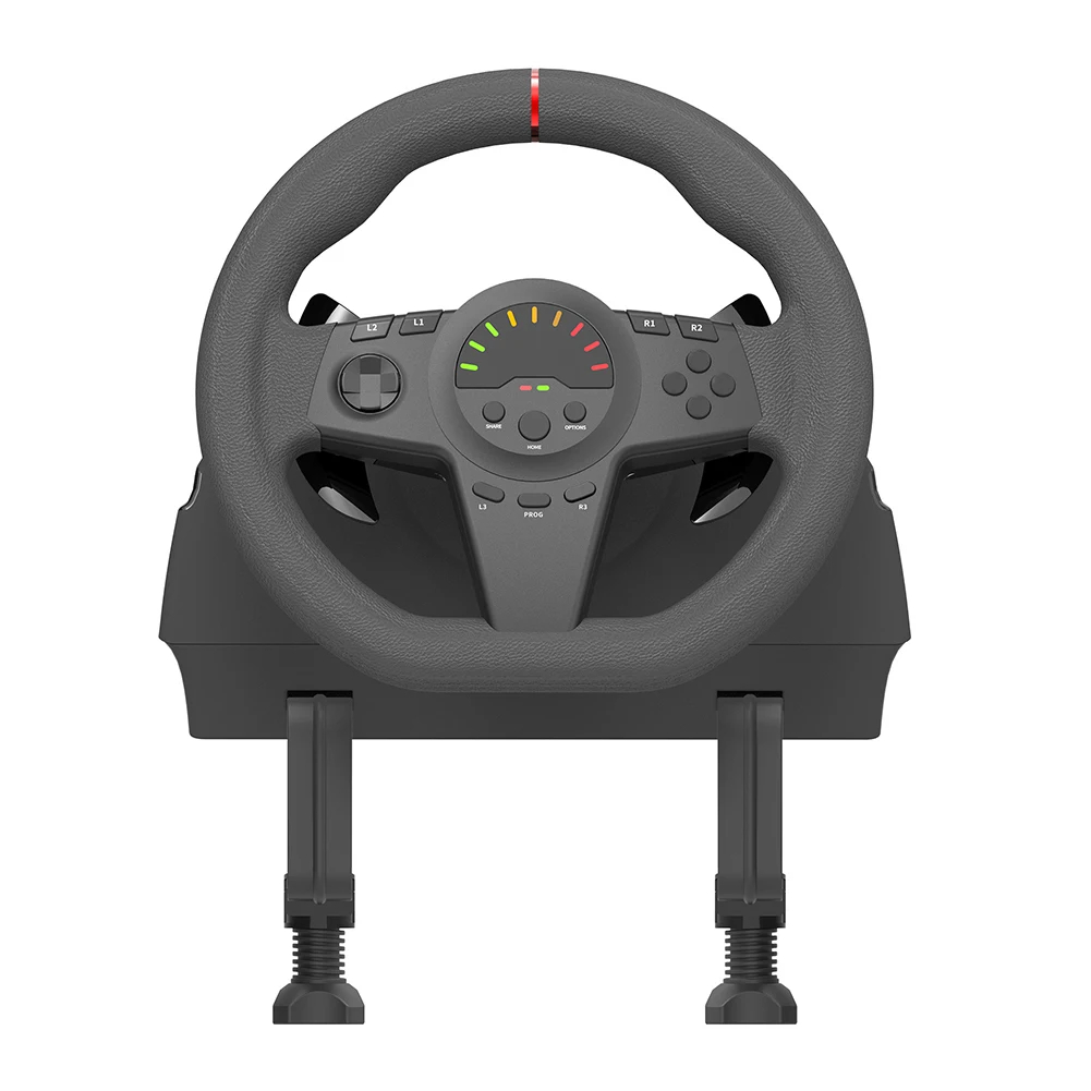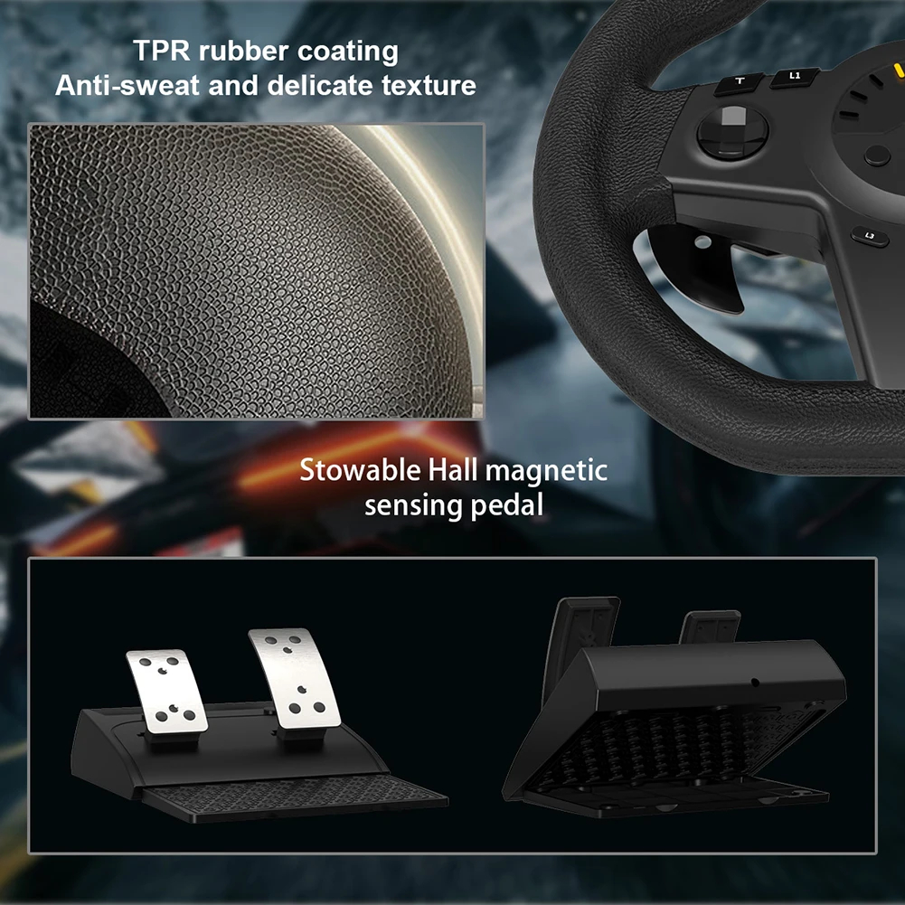HS-GT001 on langallinen Game Racing Wheel -ohjain, jossa on lineaarinen voimapalaute, 270° ohjauskääntö ja Hall-magneettiset polkimet. Yhteensopiva useiden konsolien ja PC:n kanssa. Hienorakenteinen TPR-kumipinta parantaa otetta ja ajotuntumaa.