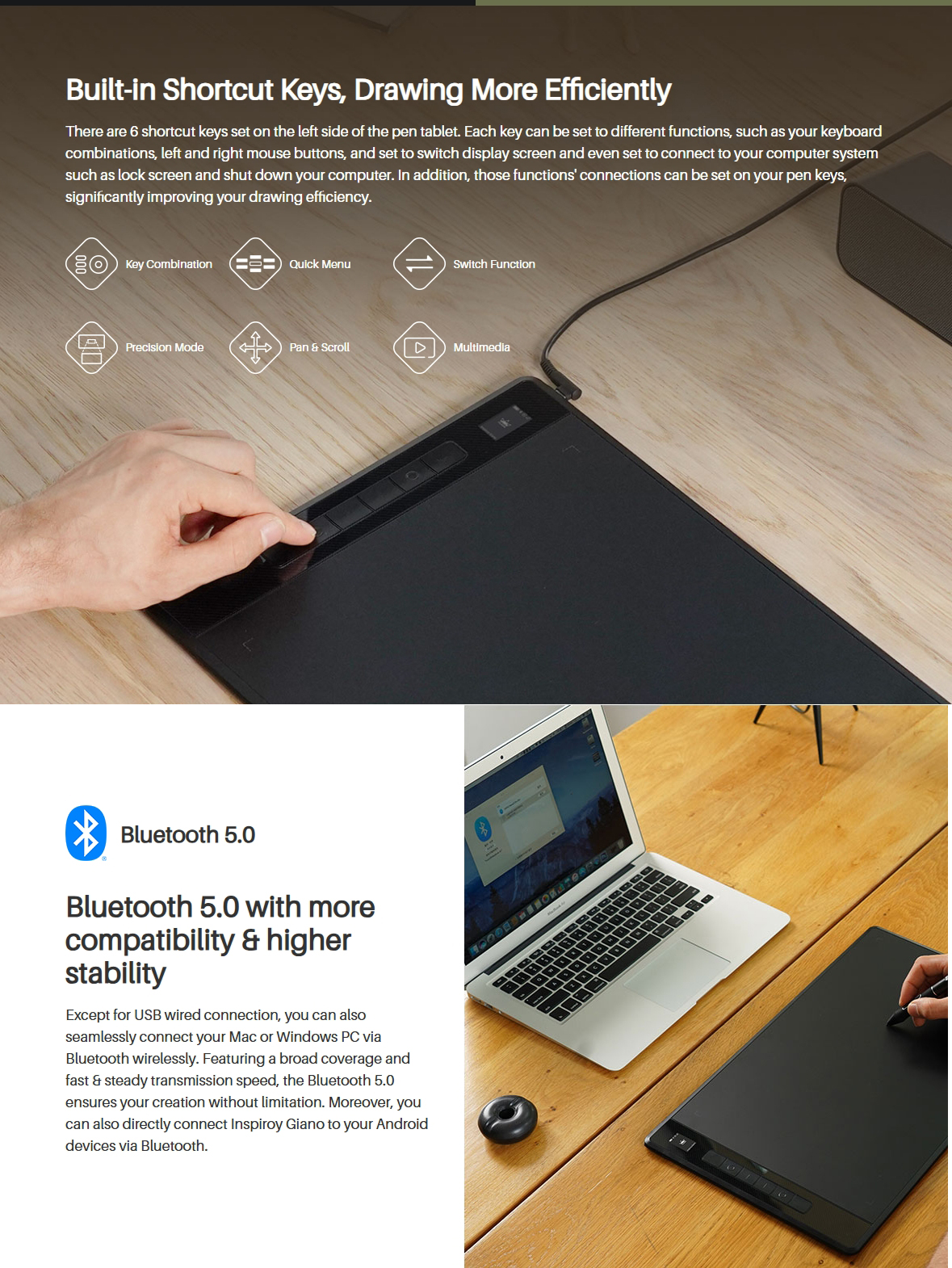 5. Joustava liitettävyys: Bluetooth 5.0 tai USB‑C kaapeli‑ ja langattomiin kokoonpanoihin, useiden käyttöjärjestelmien tuki.