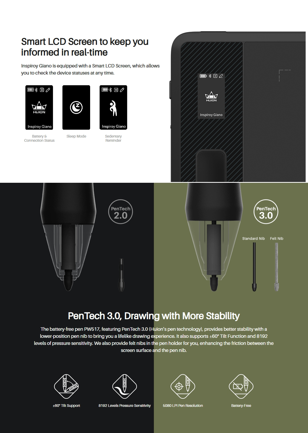 3. Edistynyt kynätekniikka: PenTech 3.0, 8192 paineentasoa, ±60° kallistuksen tunnistus ja optimoitu tarkkuus sekä vakio‑ että huopakärjillä.