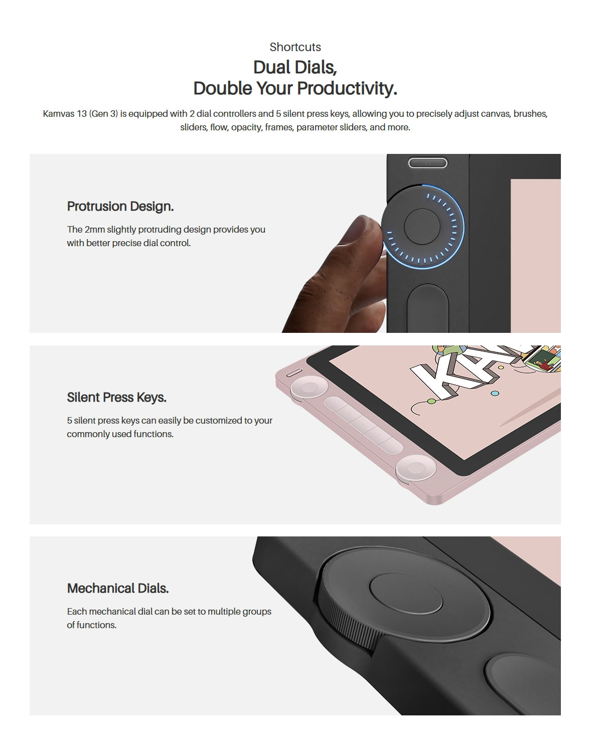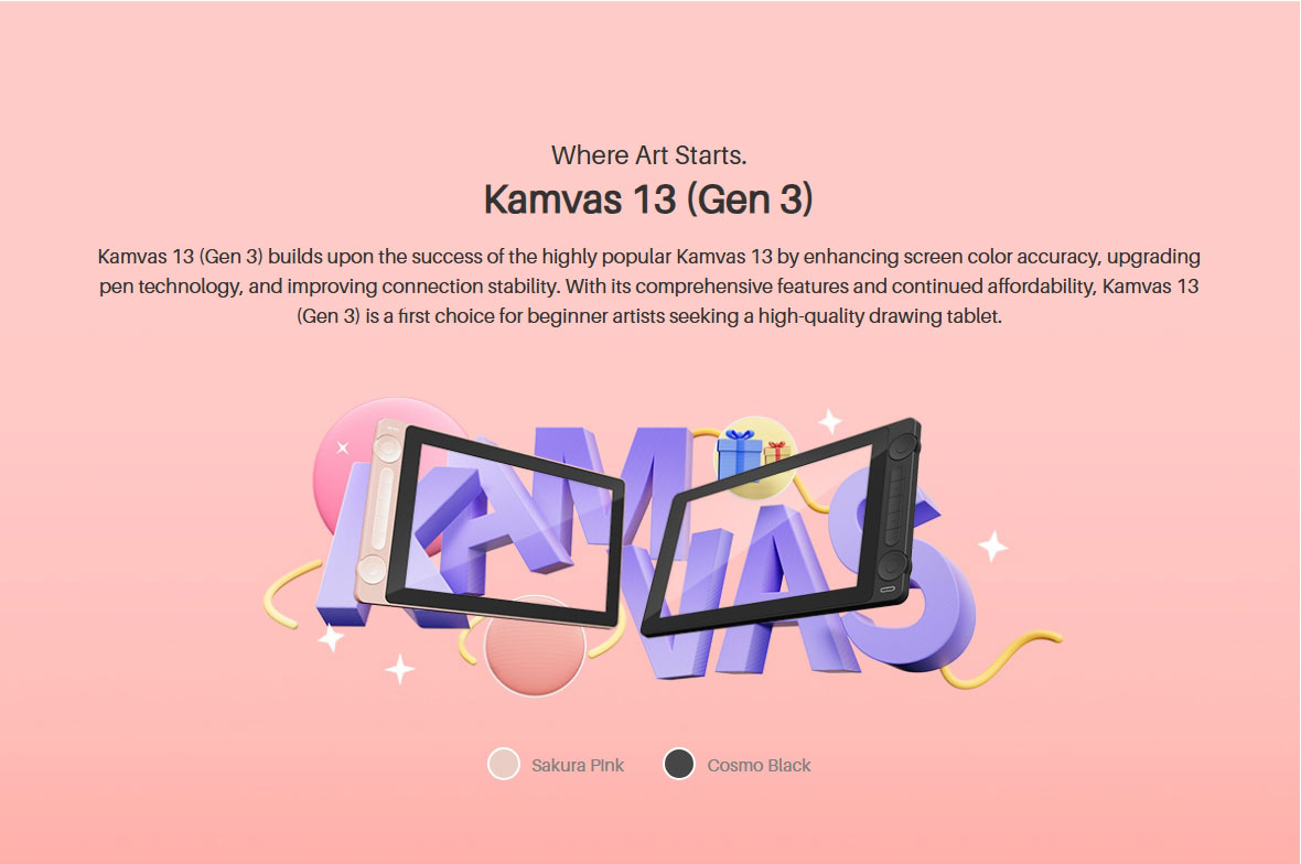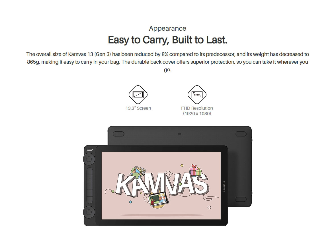 Kamvas 13 (Gen 3) on kompakti 13.3 tuuman piirtonäyttö täyslaminoidulla IPS-paneelilla, 16384 tason paineentunnistuksella ja tarkalla Pentech 4.0 -kynäteknologialla. Laaja värintoisto (120% sRGB -tilavuus) ja 2. sukupolven heijastuksia vähentävä etsattu lasi tarjoavat luonnollisen piirtotuntuman. 5 ohjelmoitavaa pikanäppäintä, 2 säätörullaa ja USB-C-liitännät tehostavat työnkulkuasi.