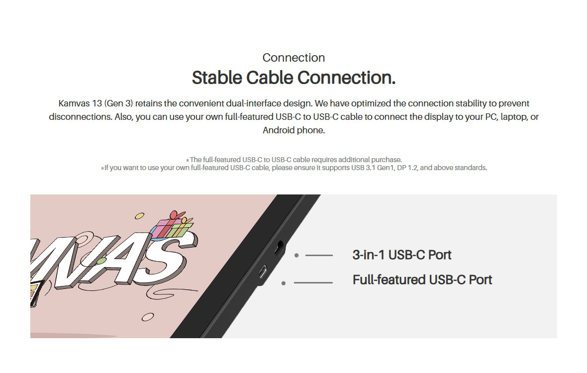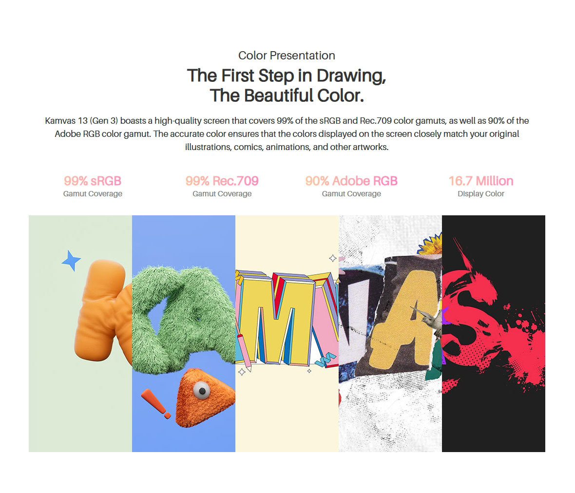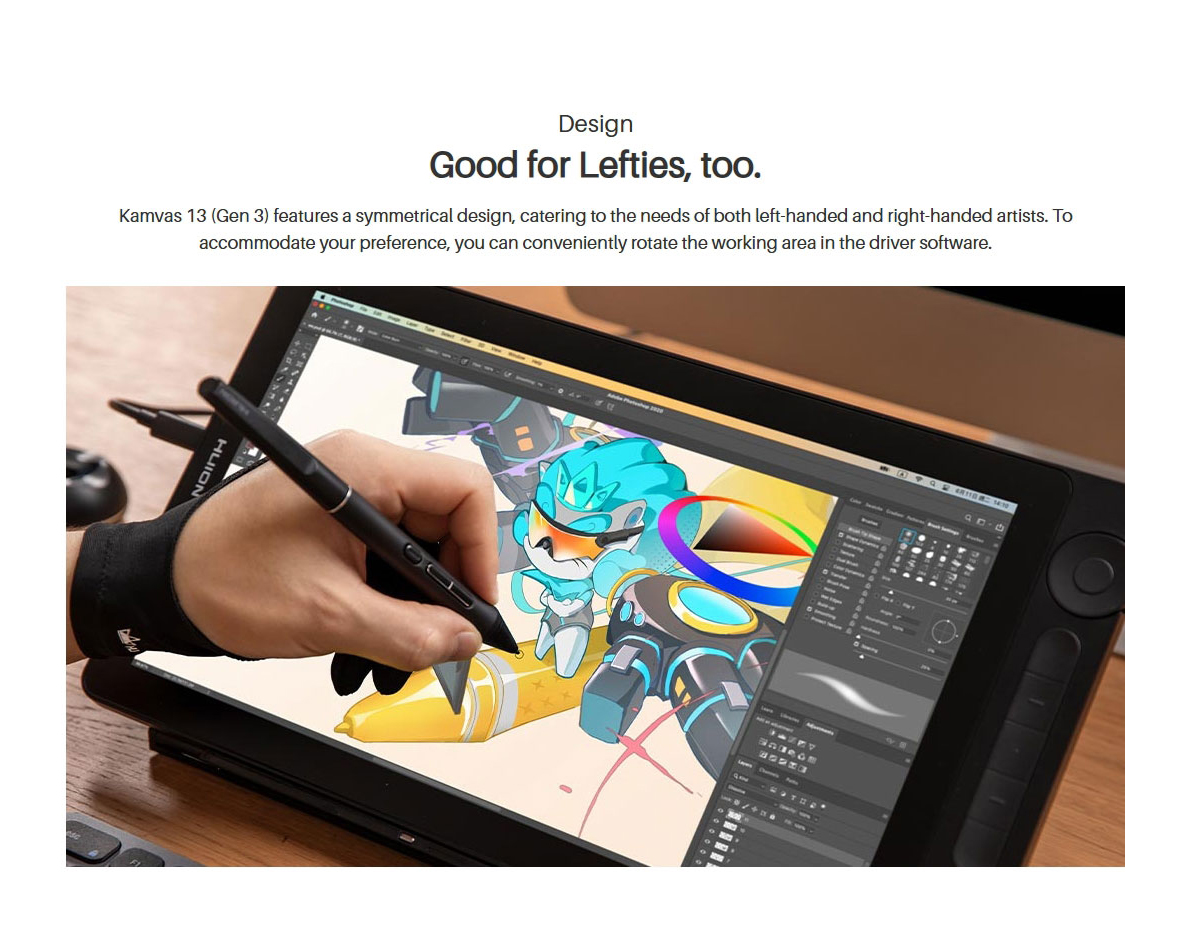 Kamvas 13 (Gen 3) on kompakti 13.3 tuuman piirtonäyttö täyslaminoidulla IPS-paneelilla, 16384 tason paineentunnistuksella ja tarkalla Pentech 4.0 -kynäteknologialla. Laaja värintoisto (120% sRGB -tilavuus) ja 2. sukupolven heijastuksia vähentävä etsattu lasi tarjoavat luonnollisen piirtotuntuman. 5 ohjelmoitavaa pikanäppäintä, 2 säätörullaa ja USB-C-liitännät tehostavat työnkulkuasi.